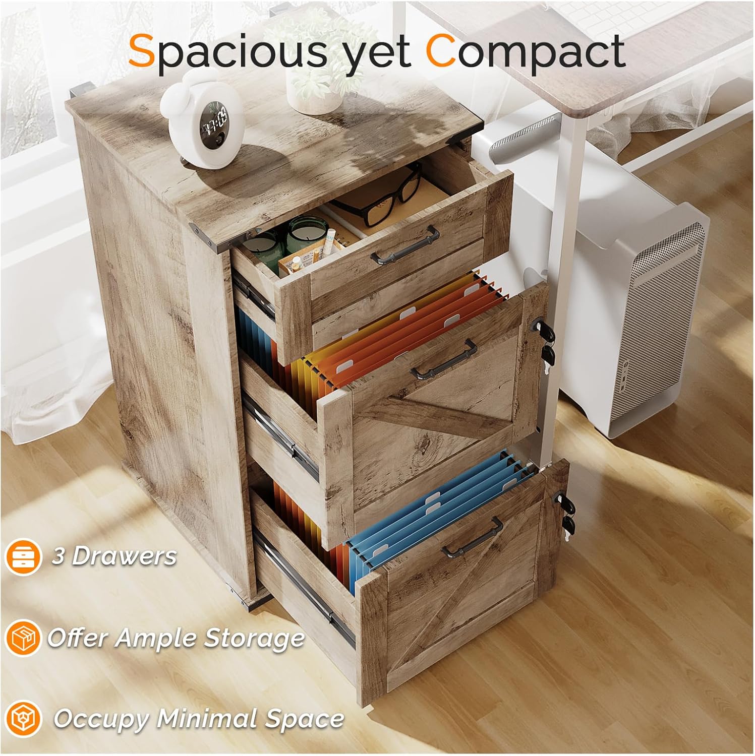 - 【Smart Storage Solutions】Boasting 2 large drawers for Letter-Size file hanging folders and a top small drawer for office/study supplies, it features partitioned storage, offering ample space while occupying a small area for efficient use.