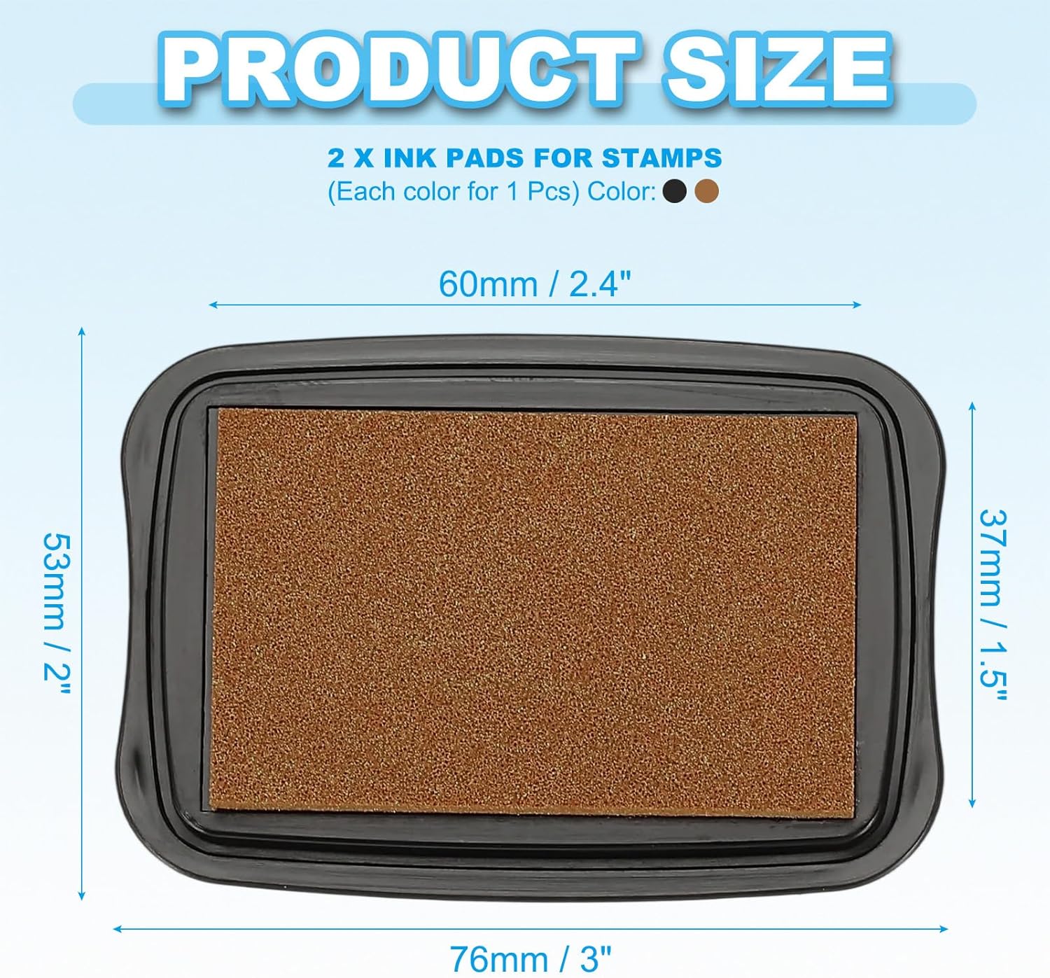 - Color: Copper, Black; Material: Sponge, Plastic; Ink Pad Size: 60 x 37mm / 2.4 x 1.5 inch(L*W); Overall Size: 76 x 53 x 18mm / 3 x 2 x 0.7 inch(L*W*T); Packing List: 2 x Ink Pads for Stamps