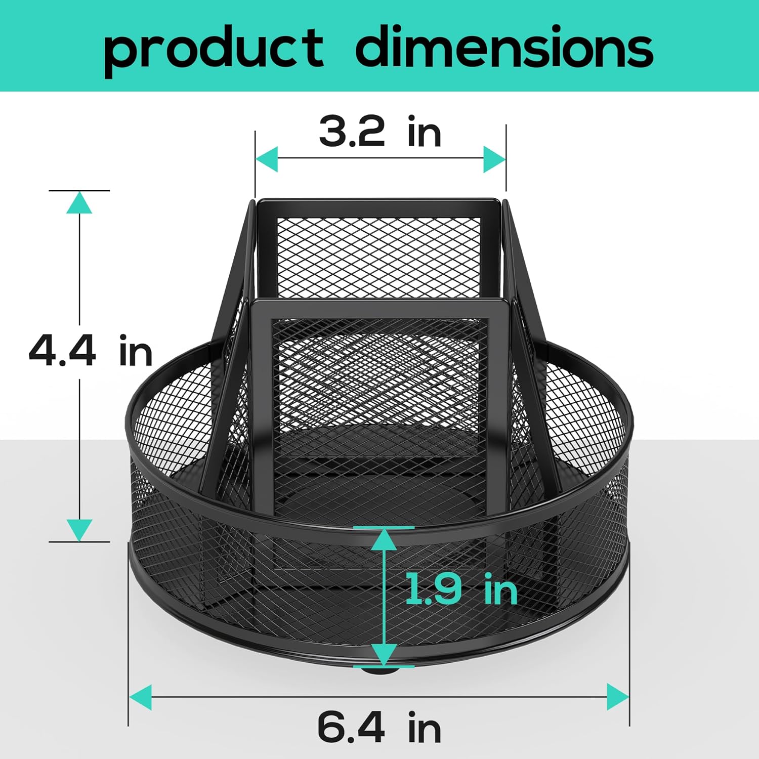 YINGHUA Metal Mesh Desk Organizer with 5 Compartments and Rotating Pencil Holder Pen and Stationery Organizer for Office Home School Anti Slip Base Black