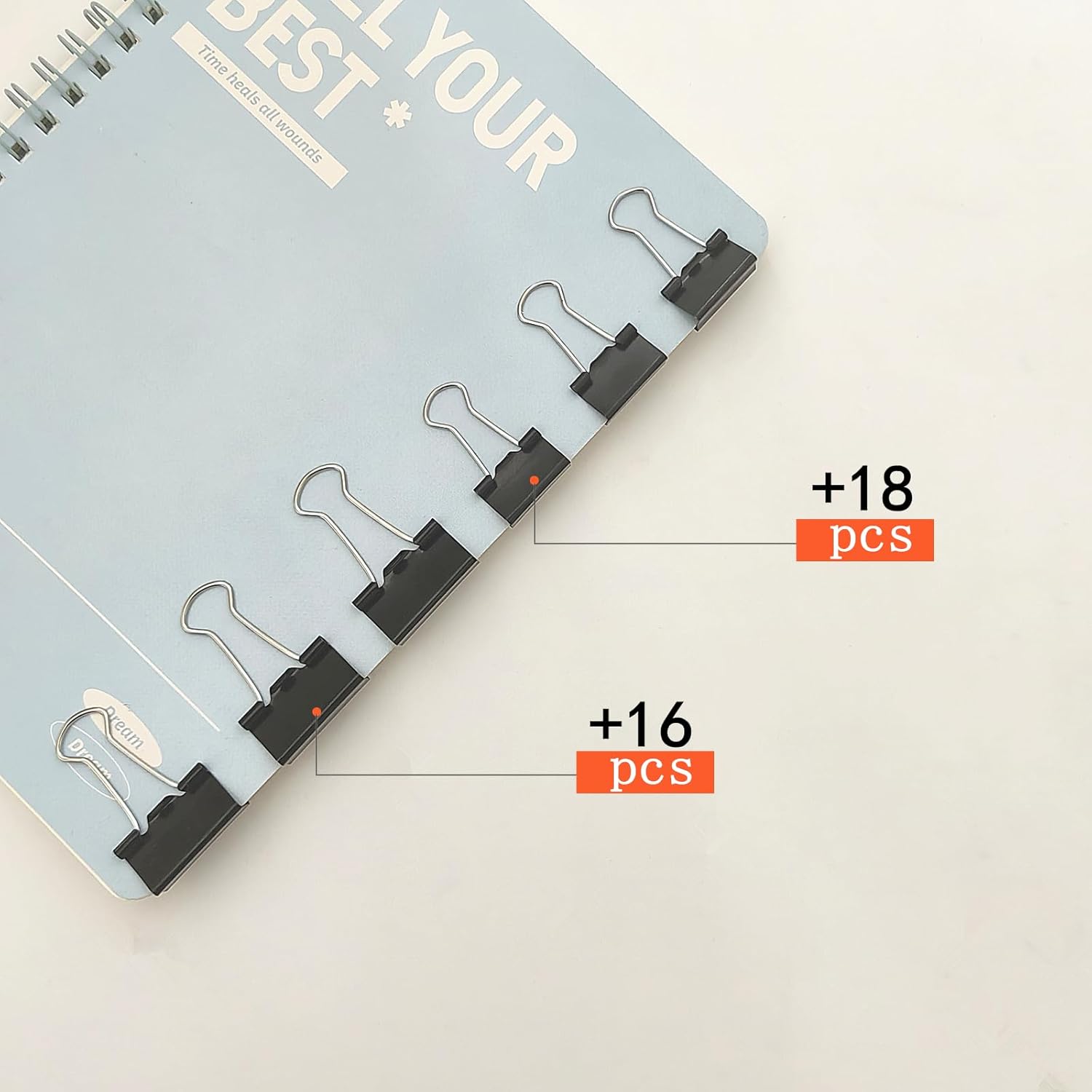 - Paper Clips and Binder Clips Set:284 Pcs assorted sizes black binder clips 16 Pcs medium binder clips (25mm/1 inch) and 18 Pcs small binder clips (19mm/0.75 inches). assorted sizes of black paperclips 100 Pcs small paperclips (28mm/1.1 inches), 100 Pcs medium paperclips (33mm/1.3 inches), and 50 Pcs large paperclips (2 inches/50mm)
