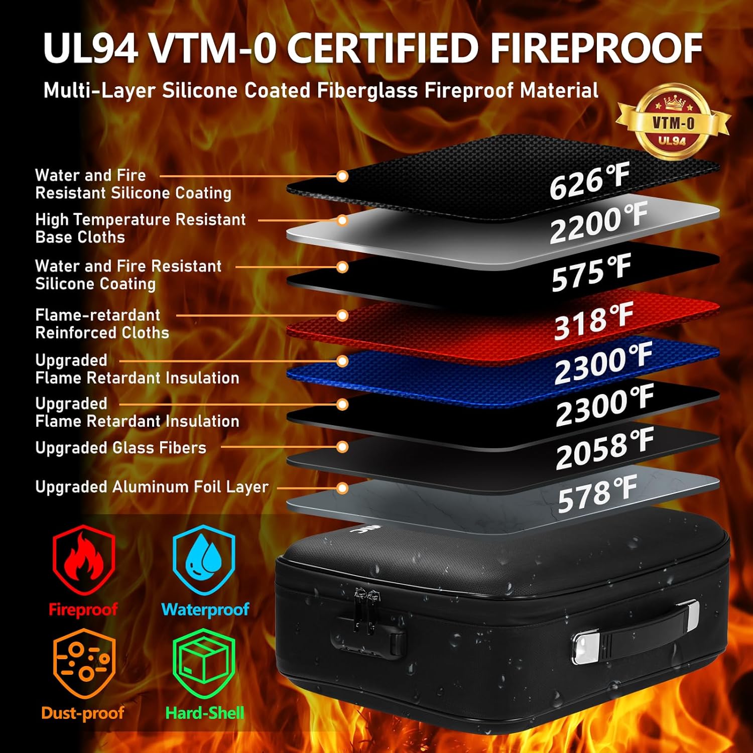 - UL-94 VTM-0 Certified Fireproof Box:The fireproof case uses UL94 VTM-0 certified dust-proof silicone fiberglass,withstanding up to 2000° for excellent insulation &waterproofing against fire/humidity, while blocking dust and sticky debris. Nothing is completely foolproof, but added protection is always a good idea