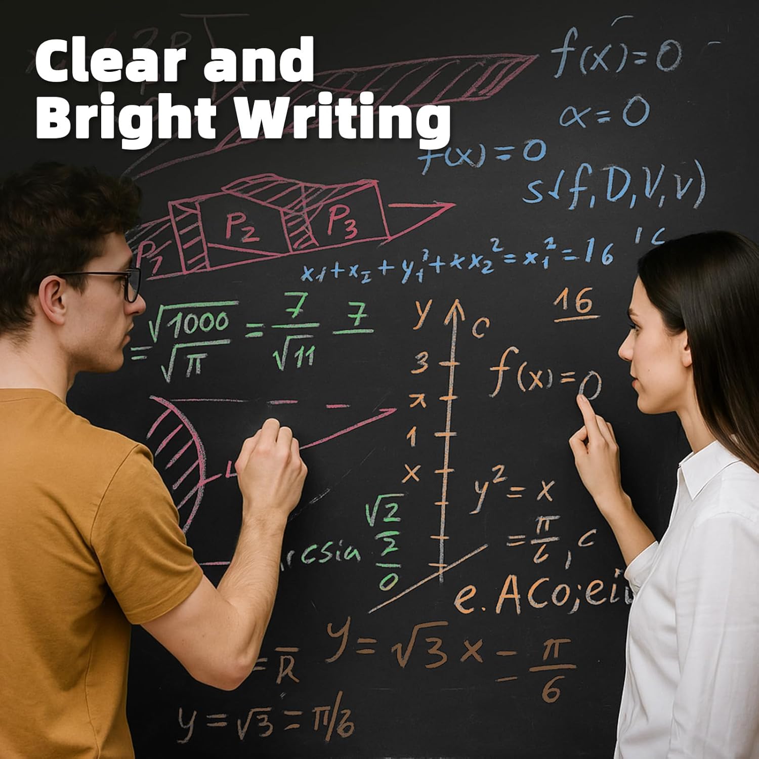- Smooth Writing & Effortless Erasing: The chalk delivers strong adhesion and vibrant color saturation, producing uniform, deep-toned lines on blackboards without uneven fading. Its dust-free design minimizes airborne particles—dry wiping requires only gentle friction, while wet wiping dissolves chalk residue completely.