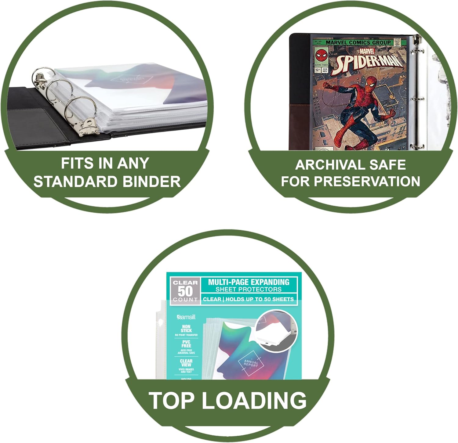 - 25 Pack of Multi Page Sheet Protectors. Samsill polypropylene sheet protectors are perfect for standard letter sized 8.5 by 11 inch paper. Our easy top loading binder sheets are wider than others, allowing conveni