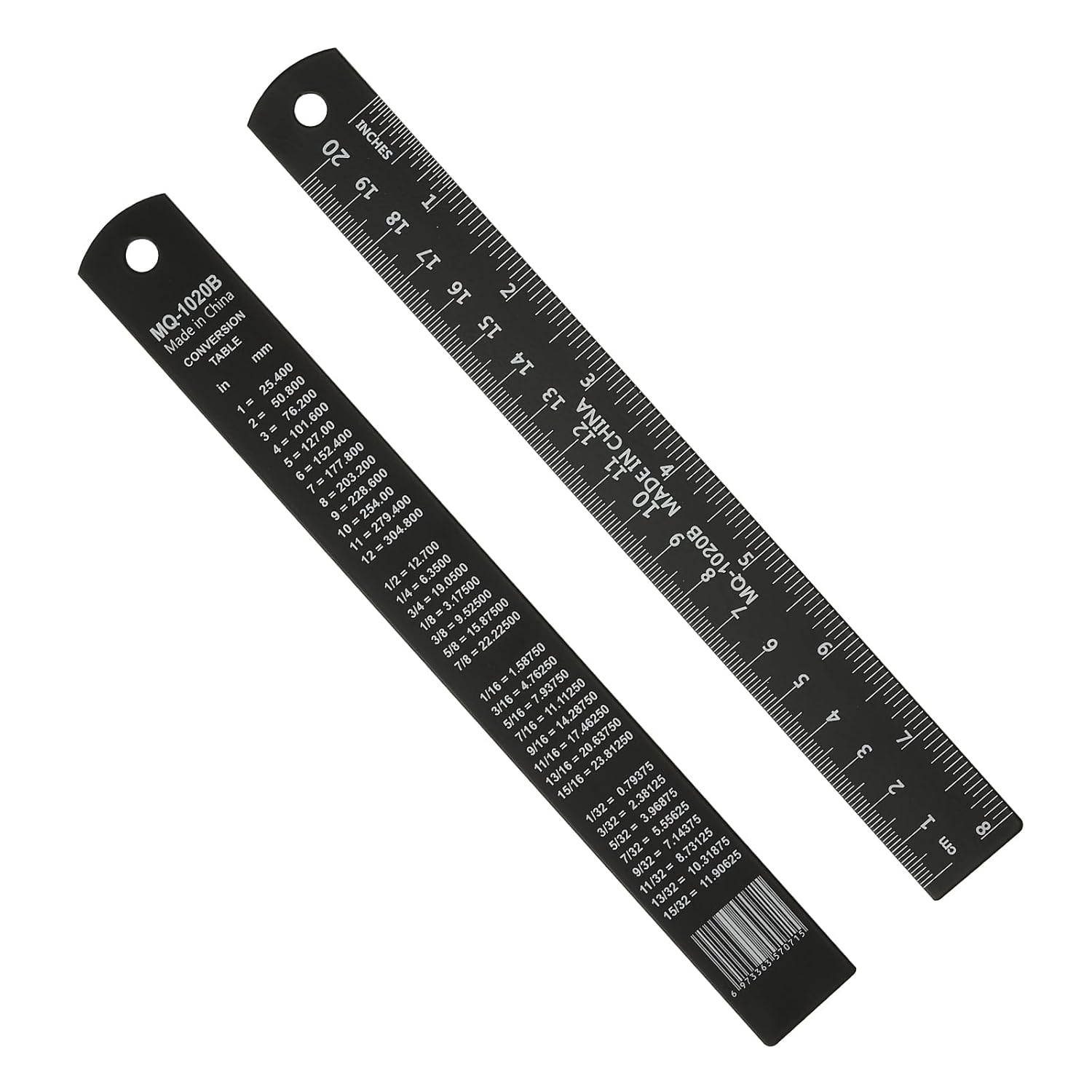 - Advantage: Made of quality aluminum alloy material, ensuring durability, rust resistance, and long-lasting use; Convenient design with rounded and smooth edges, hanging hole for easy storage, and compact size for portability. Laser etched and black anodized scales for bold, and never-fading markings; Double-sided markers with both inch and centimeter graduations, including a conversion table.