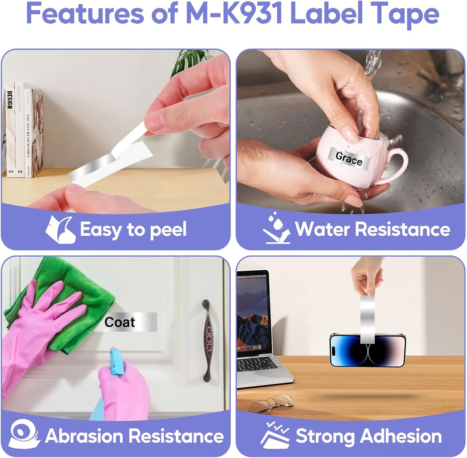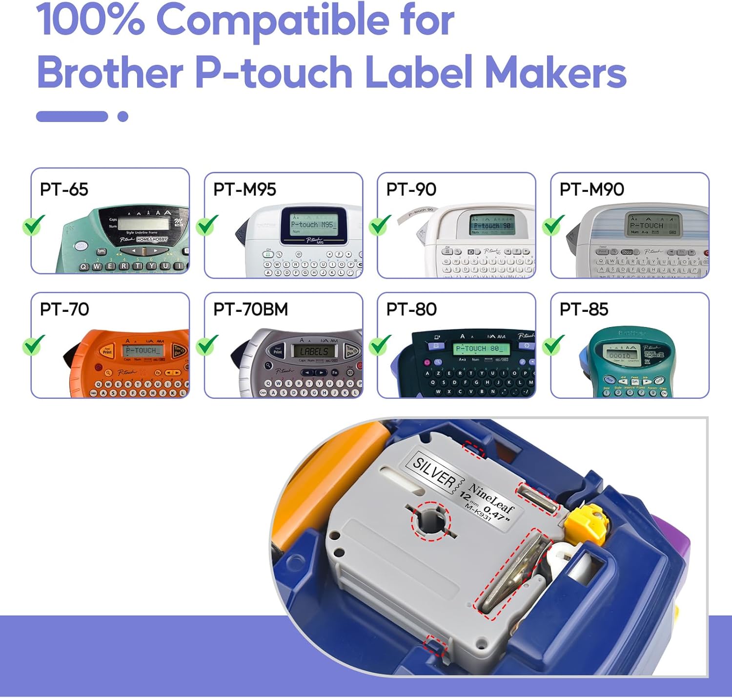 - NineLeaf 4 pack compatible for Brother p touch m tape M-931 MK931 M-K931 M931 M-K931S non-laminated label tape;Color: black on silver, length: 8m(26.2ft), width: 12mm(0.47 inch)