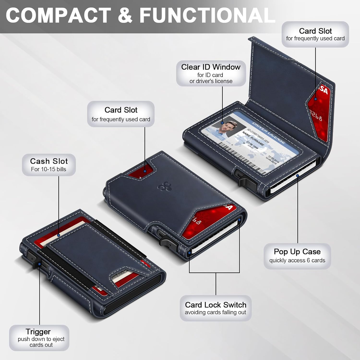 - QUICK & EASY CARD ACCESS: Unlike traditional leather wallets, SEMORID rfid wallet for men features an aluminum card case with an eject mechanism. Simply press the button and all cards pop out in a stepped pattern, making retrieval quick and convenient.
