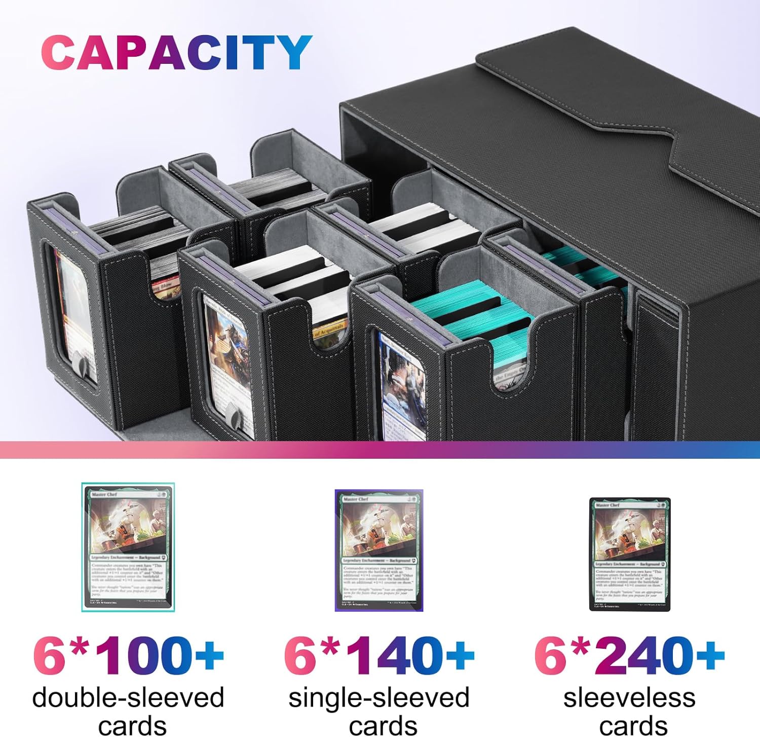 - Ample Capacity: This deck case holds 6*100+ double-sleeved cards, 6*140+ single-sleeved cards or 6*240+ sleeveless cards(MTG/PTCG/Yugioh); Also can store 6*100 Dragon Shield double-sleeved cards; Wrap your cards, dice, tokens and counters in one box