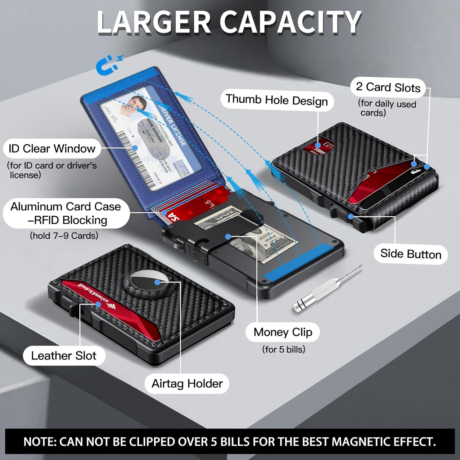 - MINIMALIST BUT LARGE CAPACITY - Our minimalist wallet for men with air tag holder fits effortlessly in pockets without bulk, yet holds 12+ cards, cash and AirTag securely. A money clip on the inside of the card holder helps you store cash(For the best magnetic effect, please DO NOT clip over 5 bills to the money click inside).