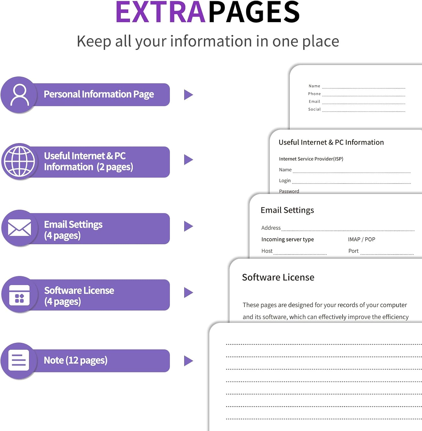 - 【Plenty of Space for Information】Our small pocket password book with 4 entries per page, and it can contain over 552 passwords. There are additional pages: Useful Internet & PC Information (2 pages), Email Settings(4 pages), Software License(4 pages), and Notes(12 pages). We have reserved a place to write a password hint instead of the password itself to ensure password security.
