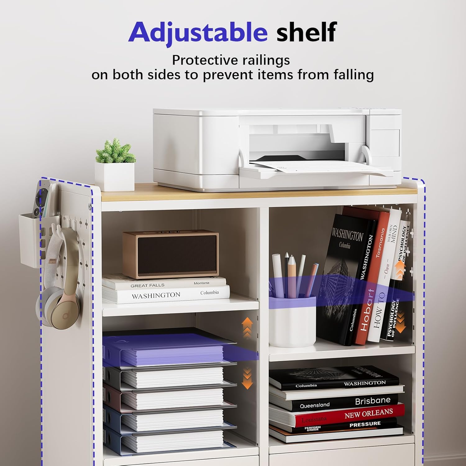 - Smart Adjustable Storage with Organizers:Organize efficiently with 2 spacious drawers (12.91"D x 10.08"W x 4.92"H) Letter files, plus 2 height-adjustable open shelves. The pegboard side includes 2 storage bins and 4 handy hooks - perfect for keeping pens, scissors and office supplies within reach.