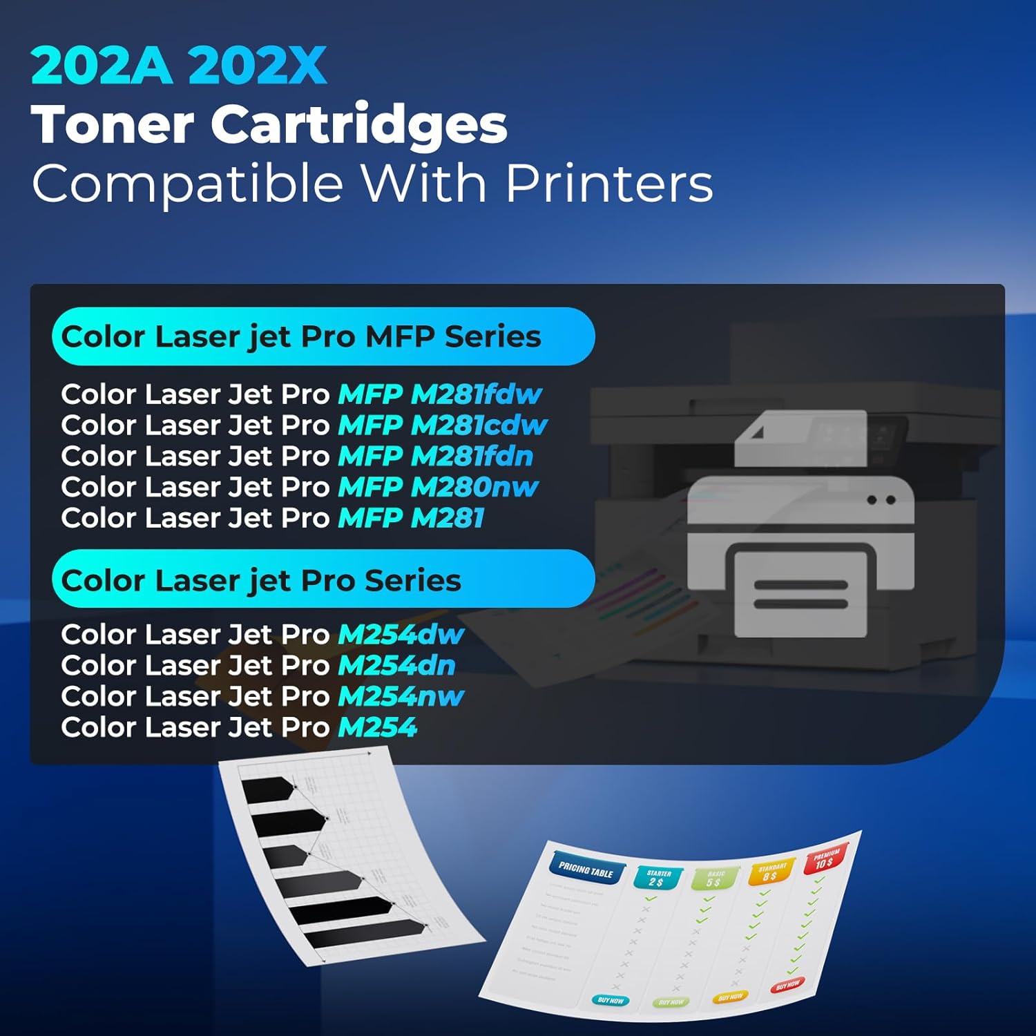 - 202X Toner cartridges Feature: Toner 202X compatible for hp 202X 202A toner cartridges Combo Pack for Color Laser jet Pro MFP M281FDW toner cartridges, Color Laser jet Pro MFP M281CDW toner cartridges, Color Laser jet Pro MFP M281FDN toner cartridges, Color Laser jet Pro MFP M280NW toner cartridges, Color Laser jet Pro MFP M281 toner cartridges, Color Laser jet Pro M254DW toner cartridges, Color Laser jet Pro M254DN toner cartridges, Color Laser jet Pro M254NW toner cartridges, Color Laser jet Pro M254 toner cartridges