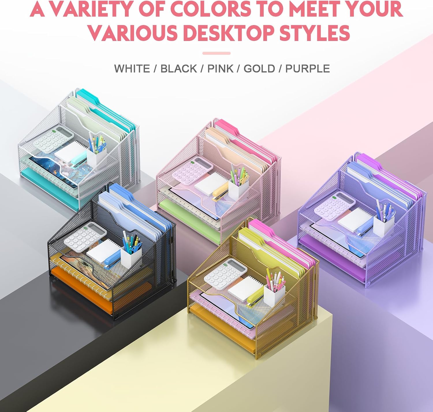 - Unique 3+2 Shelves Design: 3 Tier sliding trays are perfect for storage all your documents, file folders and other desk accessories, 2 upright section is ideal for place your other paper/letters vertically.