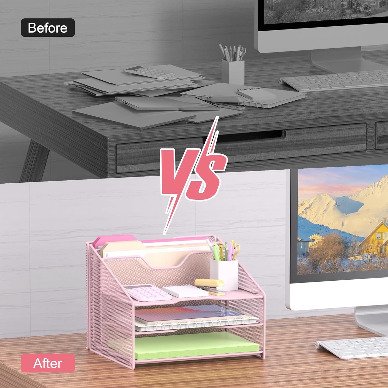 samstar Pink Desk File Organizer, Mesh Letter File Folder Holder with 3 Paper Trays and 2 Vertical Upright Section, for Office Supplies, Desk Accessories & Workspace, Pink