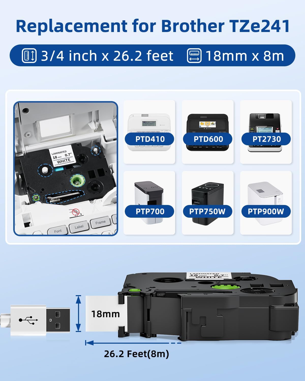- Package included: 5-Pack compatible with Brother PTouch Label Tapes TZe-241/TZ-241/TZ241, Black on White, 0.7 Inch (18mm) x 26.2 feet (8m) for each tape