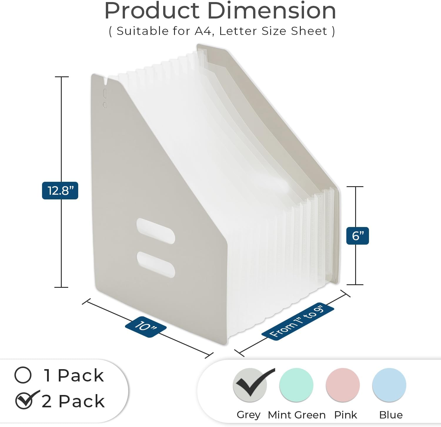 Y YOMA 2 Pack Expanding Magazine Holder with 13 Pockets | Portable Desktop Plastic Self Standing Accordion File Organizer for A4 Letter Size Document Storage Home Office School, Grey