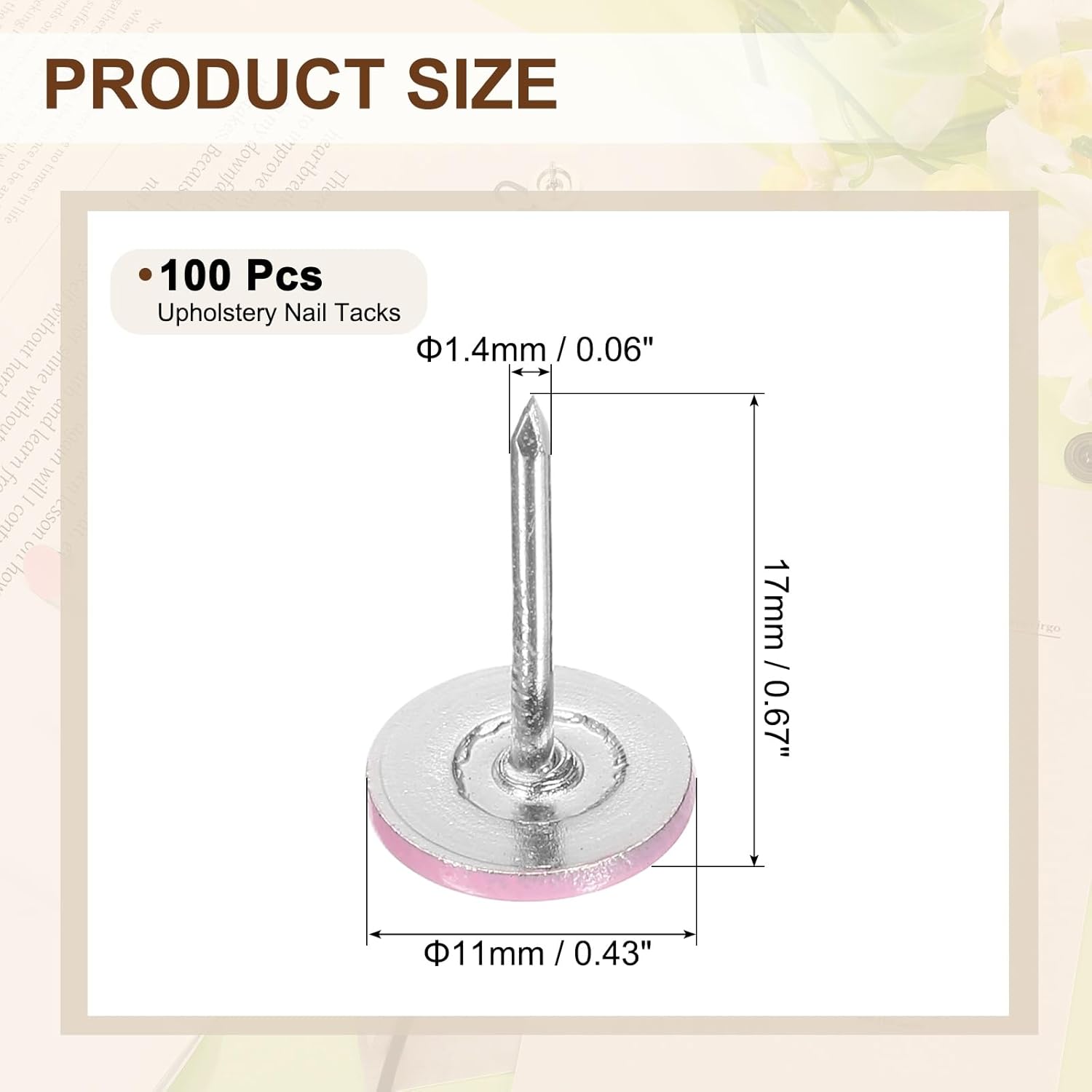 - [Size & Quantity] - The package comes with 100pcs decorative upholstery tacks. Sufficient quantity to meet your different daily needs. The overall size of upholstery nails is about 11mm x 17mm/0.43-inch x 0.67-inch(D*H)