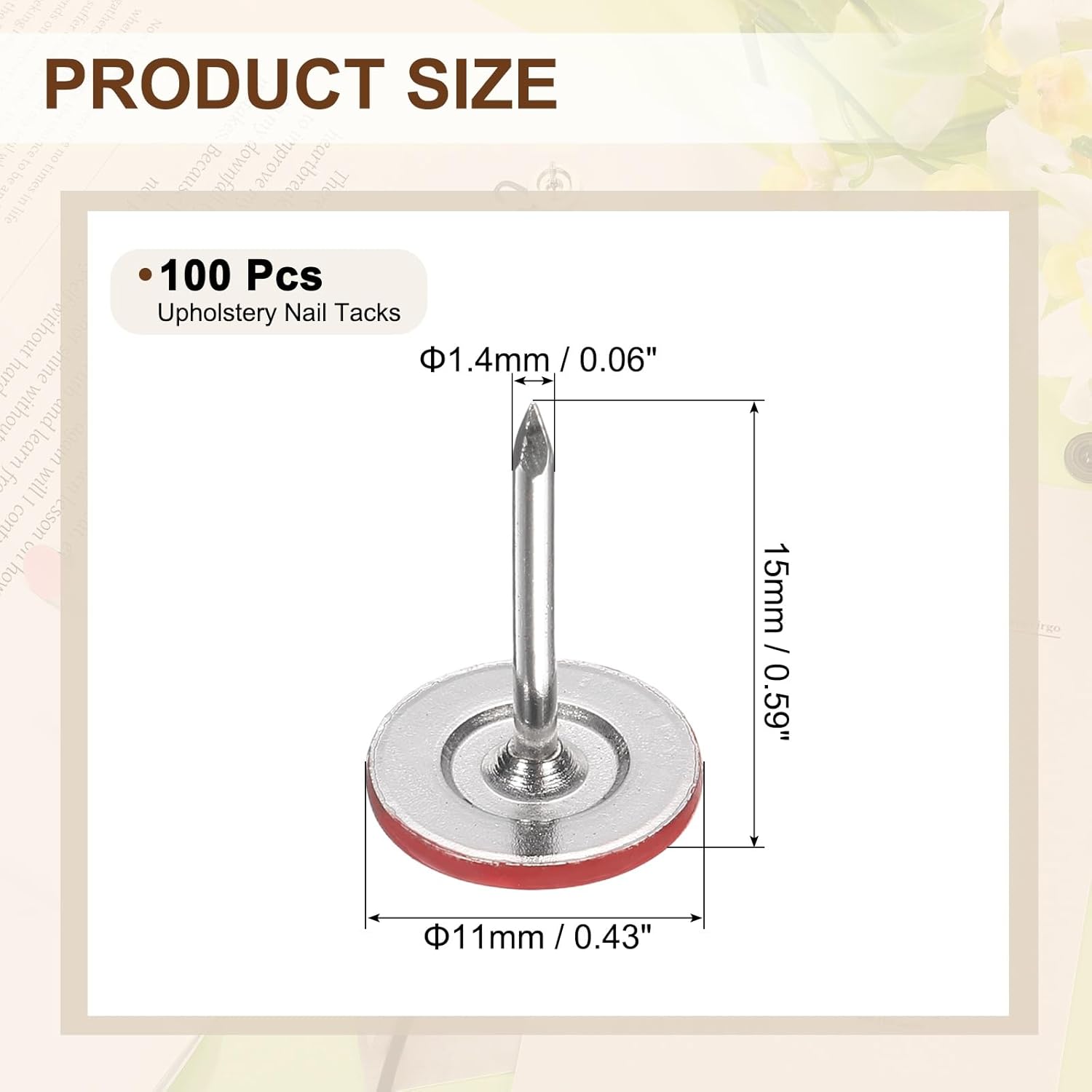 - [Size & Quantity] - The package comes with 100pcs decorative upholstery tacks. Sufficient quantity to meet your different daily needs. The overall size of upholstery nails is about 11mm x 15mm/0.43-inch x 0.59-inch(D*H)