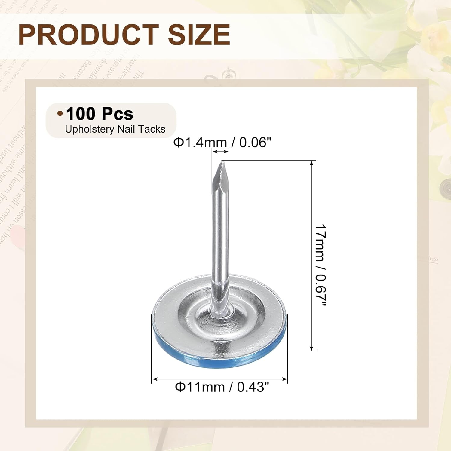 - [Size & Quantity] - The package comes with 100pcs decorative upholstery tacks. Sufficient quantity to meet your different daily needs. The overall size of upholstery nails is about 11mm x 17mm/0.43-inch x 0.67-inch(D*H)