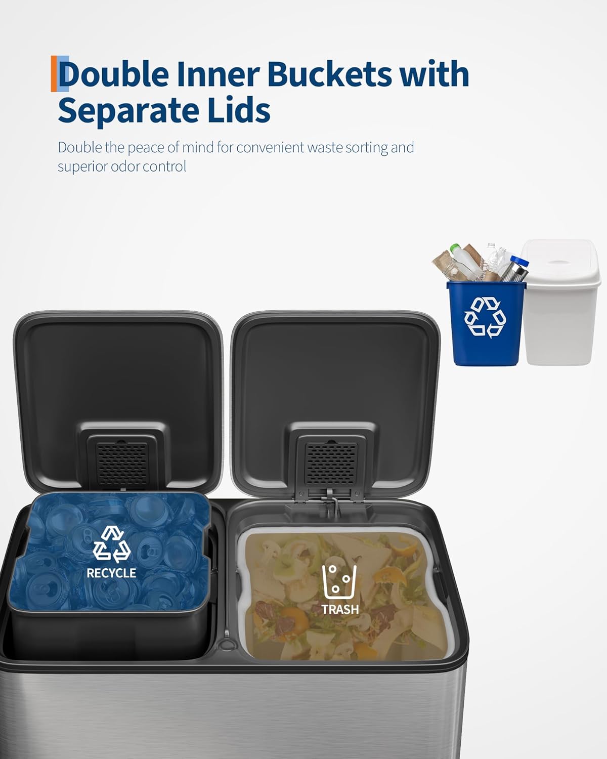 GarveeHome 2 x 10.6 Gallon Stainless Steel Double Trash Can with Lid for Kitchen, Large Dual Trash and Recycle Bin Combo, Step-on Kitchen Metal Garbage Cans, PP Inner Buckets, Liner Rim, Silver