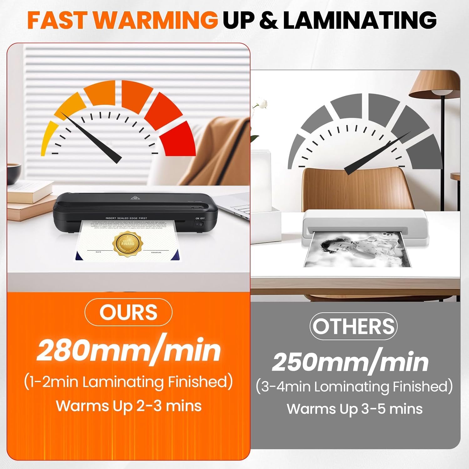 - The combination of a 2 minutes warm-up time and a maximum speed of 40 inches per minute optimizes efficiency for your lamination projects. It takes only four minutes to laminate ten 3-mil letter-sized pouches from the moment it is powered on. Suitable for Home/Office/School