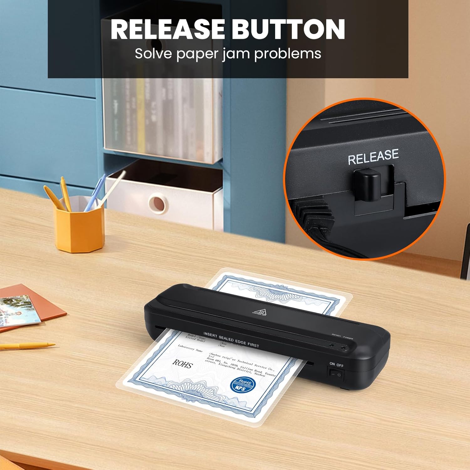 - Our laminating machine is equipped with an ABS button specifically designed to minimize paper jams. With a simple press of the "Jam-Release" button, you can effortlessly extract documents using one hand while ensuring your files remain intact. Bid farewell to jams and embrace a seamless laminating experience