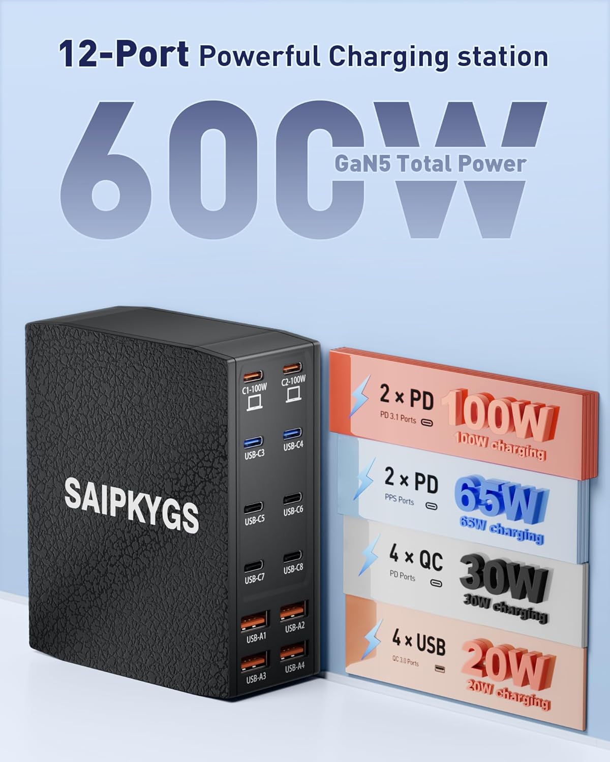 - 【12-in-1 USB C Charging Station】This 600W USB C Charger Block comes with 8 USB C ports and 4 USB A ports to charge multiple devices, simplify your charging setup, and let you experience the convenience of ultra-fast and ultra-high output charging. With its smart charging technology, it can automatically detect and provide the best power output for each connected device, ensuring fast and efficient charging.