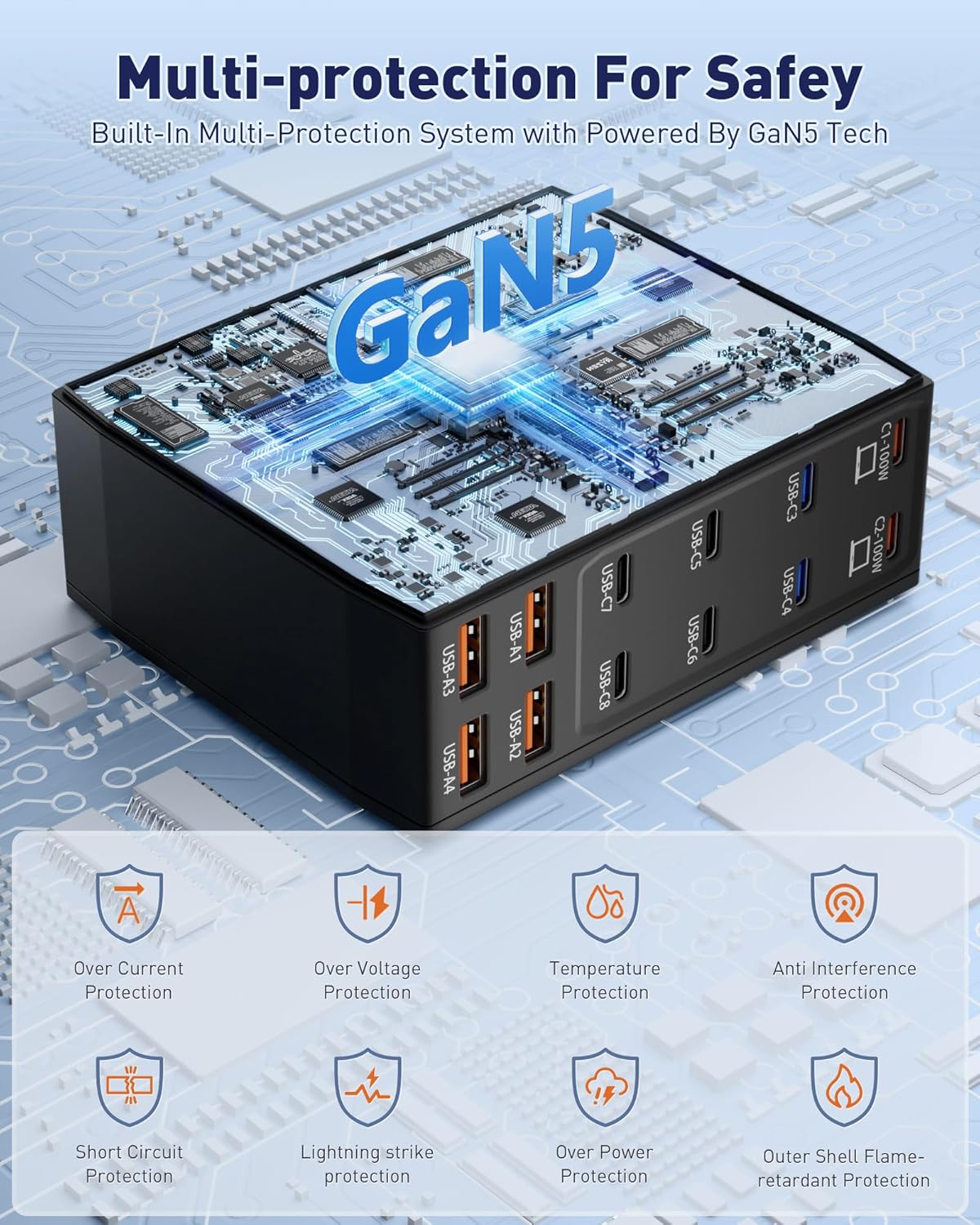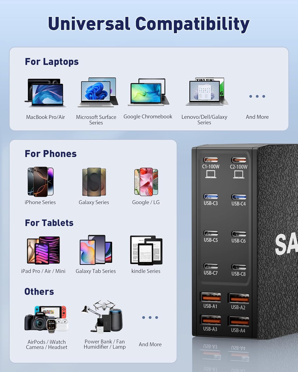 - 【Universal Compatibility】Our USB C charging station is equipped with 2*100W and 2*65W fast charging ports, which can charge 3 or more laptops at the same time. Compatible with smartphones, tablets and laptops, suitable for MacBook Pro/Air, Dell XPS, iPad Pro, iPhone 16/16 Pro Max, iPhone 15 Pro Max, iPhone 14/13 Pro/12 Pro Max, iWatch, AirPods, Surface Pro, Galaxy S24 Ultra, Switch, Steam Deck, Google Pixel and many other devices.