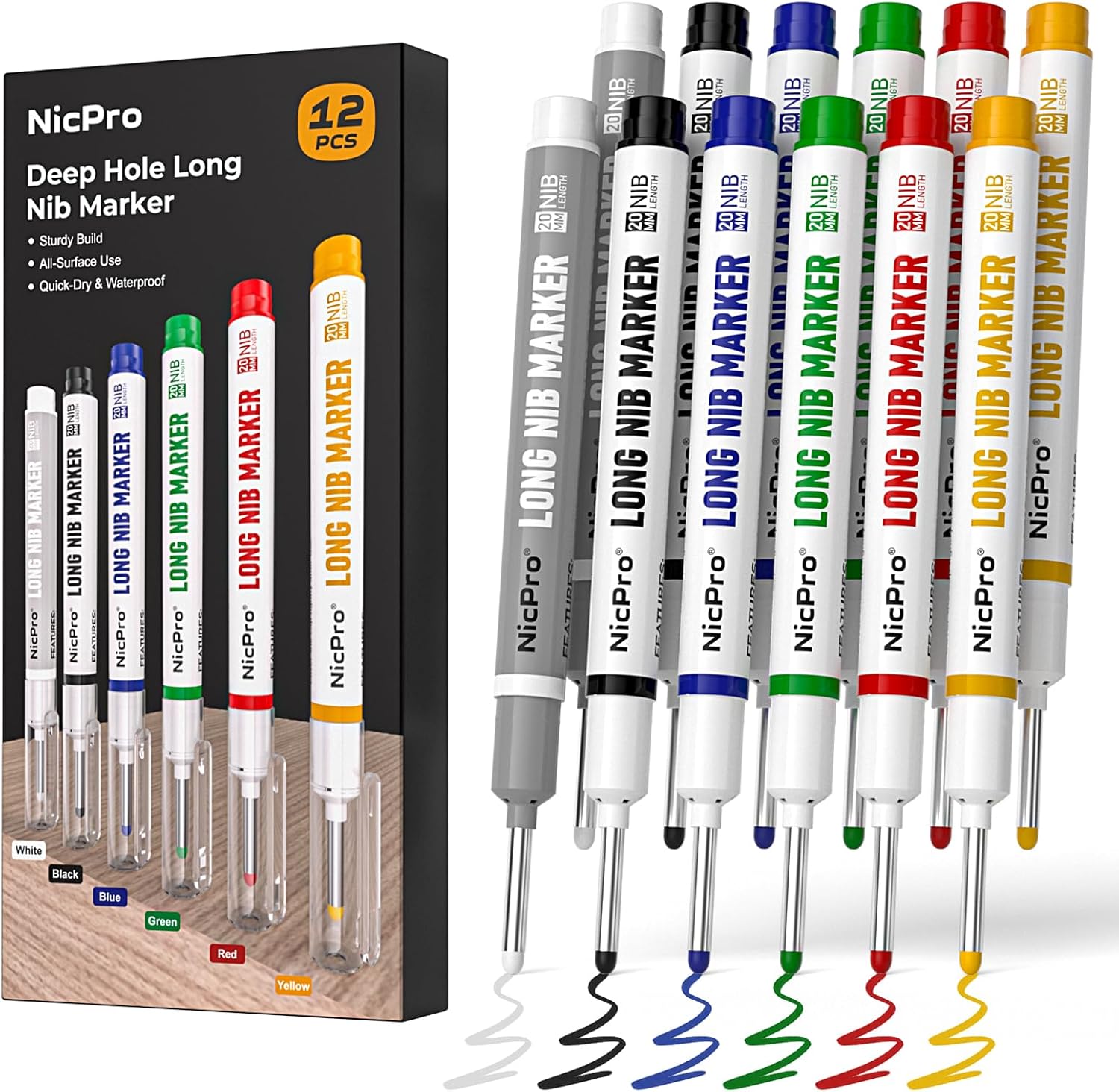 Nicpro 12 PCS Long Nib Marker Pens, 20mm Deep Hole Markers, Quick Dry & Waterproof Construction Marker, Long Head Mark Pens for Metal, Steel, Tile, Glass, Carpenter Marking Tool for Woodworking