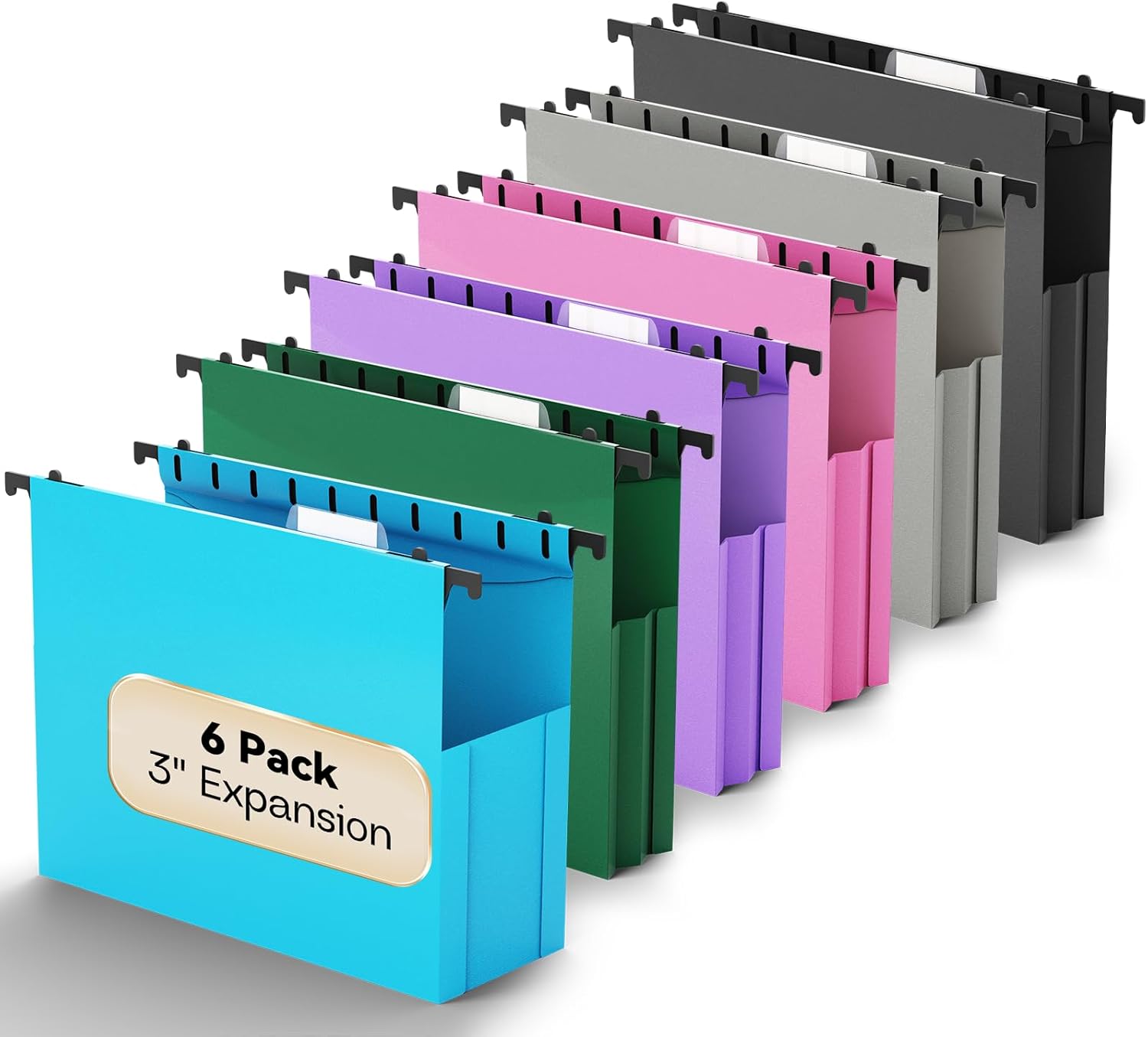 Plastic Expandable Hanging File Folder Letter Size,Heavy Duty 3 Inch Expansion,6 Pack Extra Capacity Hanging Folders,Accordian Pocket,Adjustable Tabs,Hanging Organizer for Bulky Files-Colored