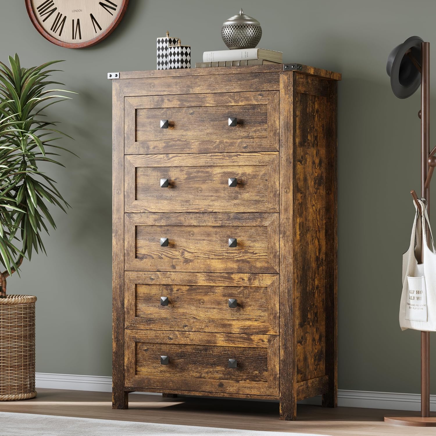 - Sturdy & Durable Construction: Made from high-quality engineered wood, BORNOON 5-drawer dresser is built to last. The scratch-resistant finish withstands daily use, and the reinforced bottom track system ensures smooth and quiet drawer operation. A stable base prevents wobbling, while the included anti-tip kit enhances safety, making it a secure choice for your home.