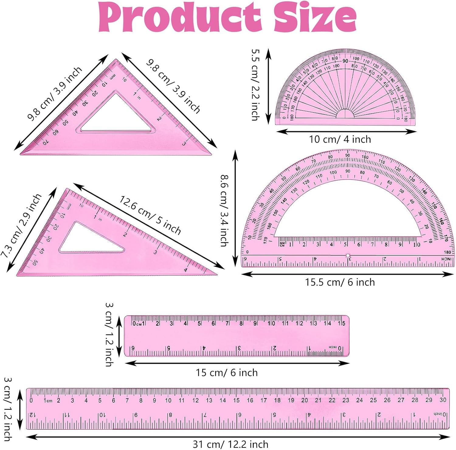Tenare 1 Set Plastic Clear Math Set Includes Protractor Triangle Rulers 12 Inch 6 Inch Straight Geometry Math Transparent Ruler Measuring Tool for School Office Home Supplies(Pink)