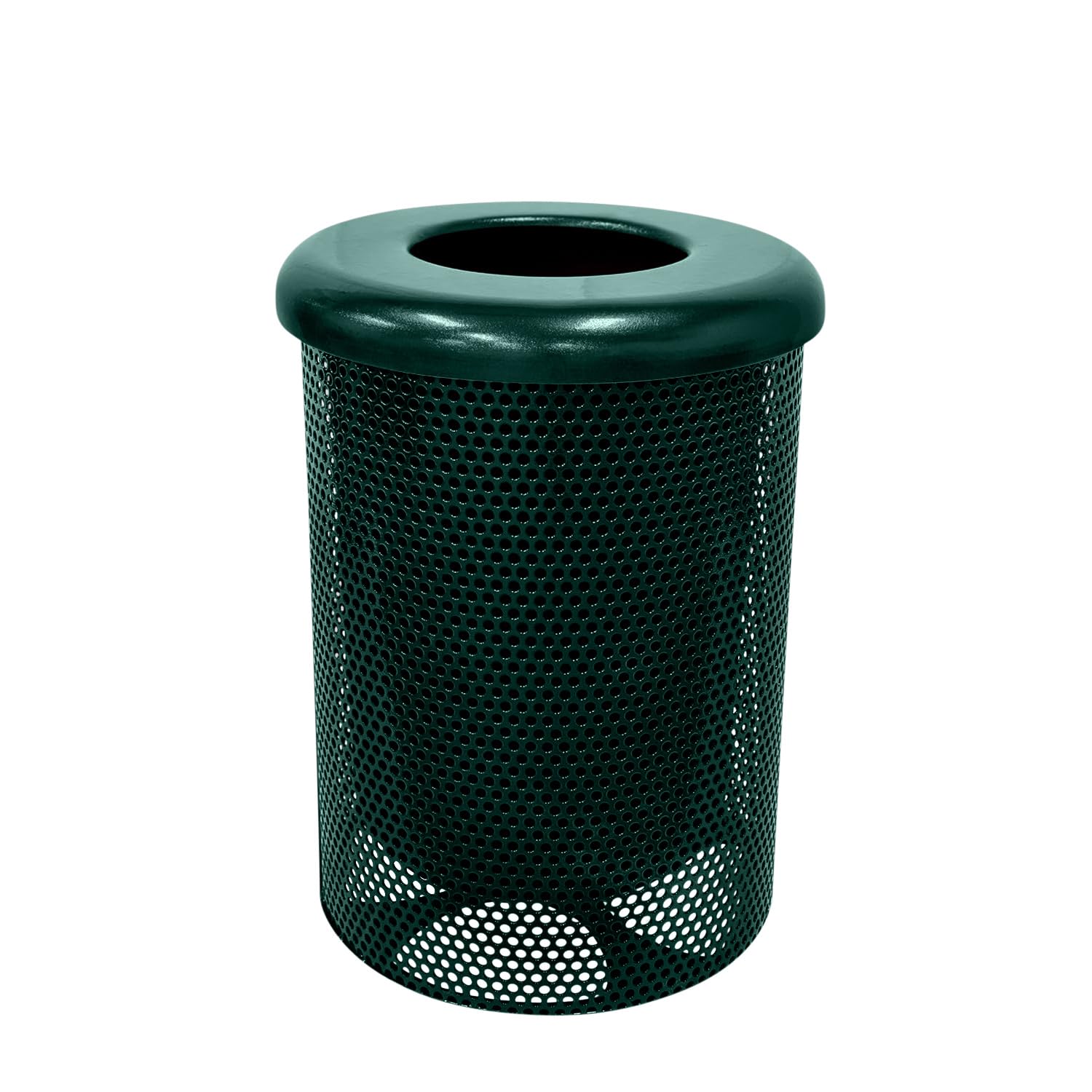 Coated Outdoor Furniture 32-Gallon Heavy-Duty Punched Steel Round Trash Receptacle, Commercial Outdoor Waste Bin with Liner & Black Flat Top Lid – Made in America (Textured Dark Green)