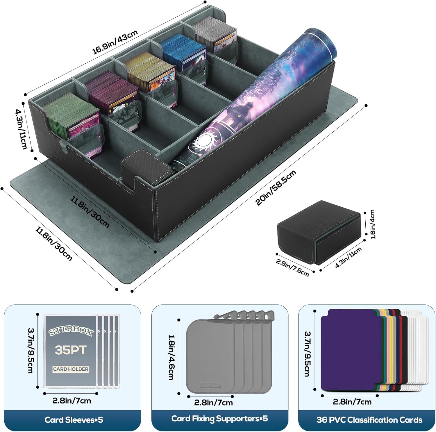 5-Row MTG Deck Box with Commander Display, Trading Card Storage Box for MTG TCG Sports Card,Card Deck Box with 1 Sieve box, 5 Toploaders, 5 Stoppers, 36 Colorful Dividers (Black & Grey)
