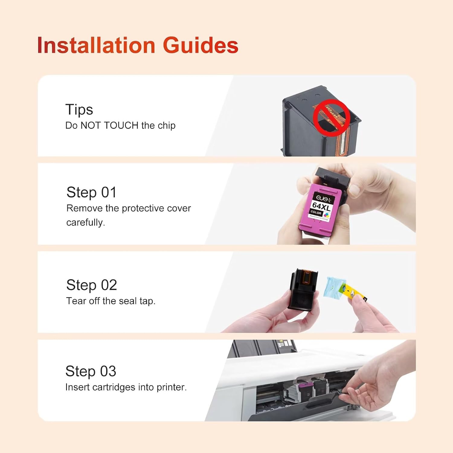 - Upgraded with Latest Chips: ejet for hp ink 64xl black and color combo pack xl is equipped with upgraded smart chip to ensure each ink cartridge will be 100% recognized by listed printers smoothly and displayed by the printer listed for accurate ink level, and ink level monitoring is always easily visualized.