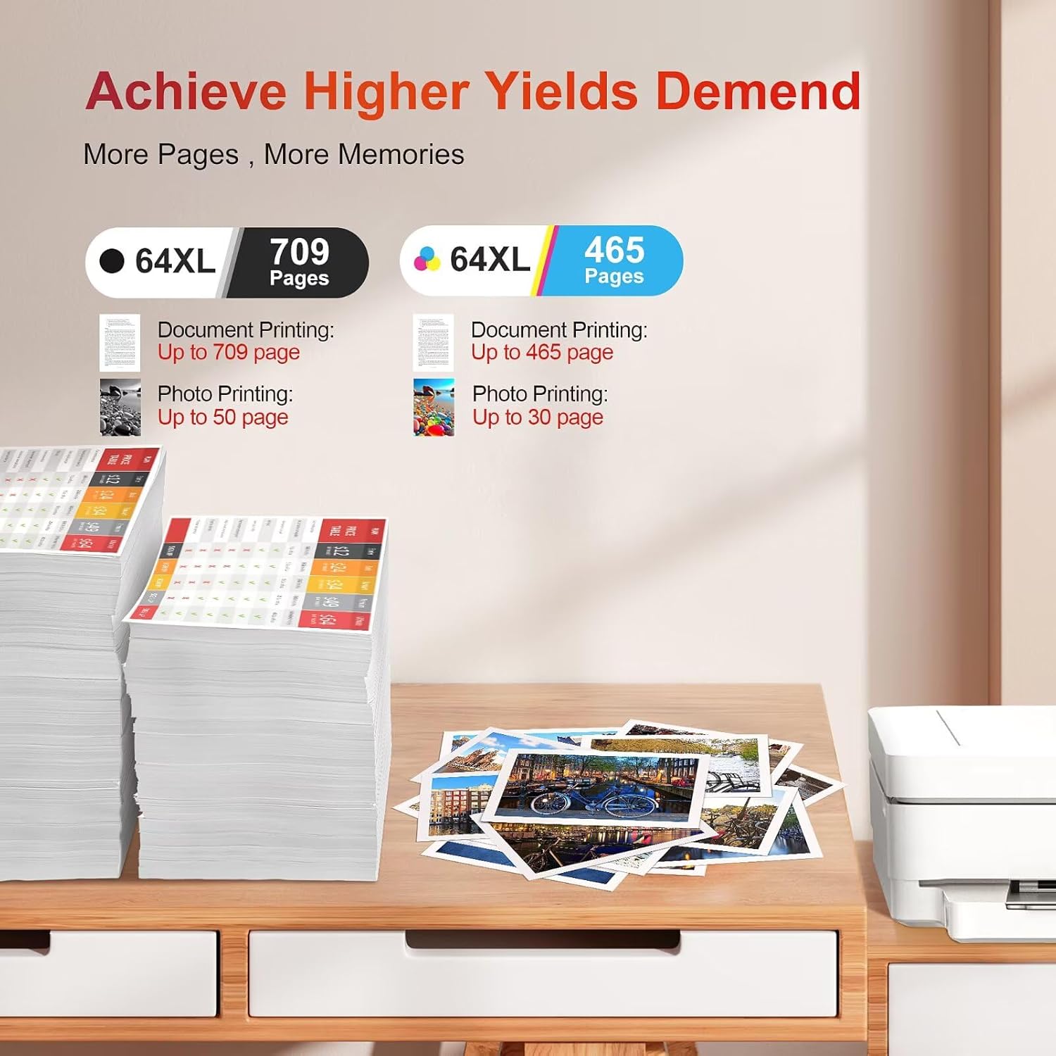 - Cartridge Page Yield for HP 64xl ink cartridge combo pack: Up to 709 pages per 64xl black ink cartridge, 465 pages per 64xl color ink cartridges (at 5% coverage).
