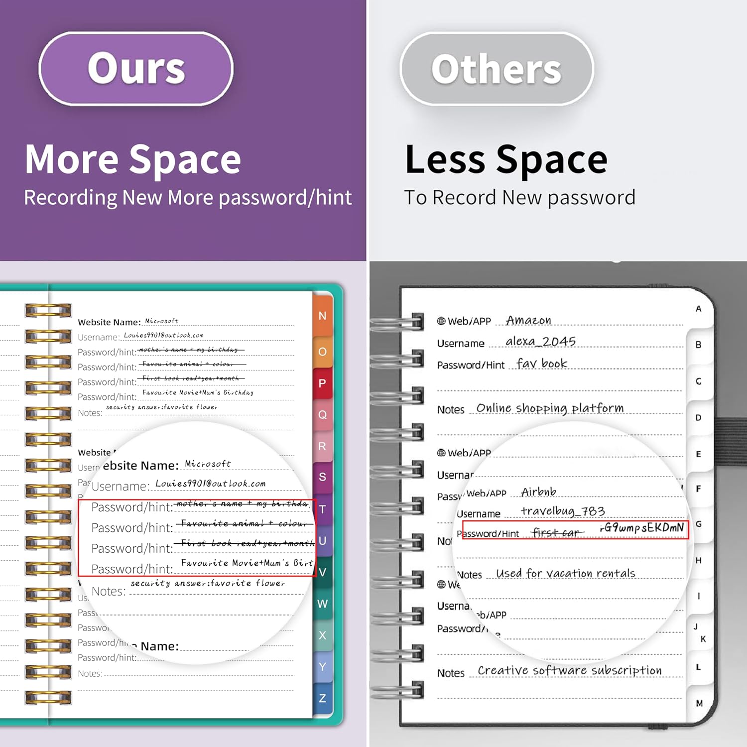 - Sturdy Spiral Password Notebook with Ample Writing Space: Built with a durable spiral binding and 100GSM thick pages, this password notebook lays flat for easy writing. Each page provides generous space for usernames, passwords, and hints. The "hints" design can better keep your password confidential and prevent it from being leaked