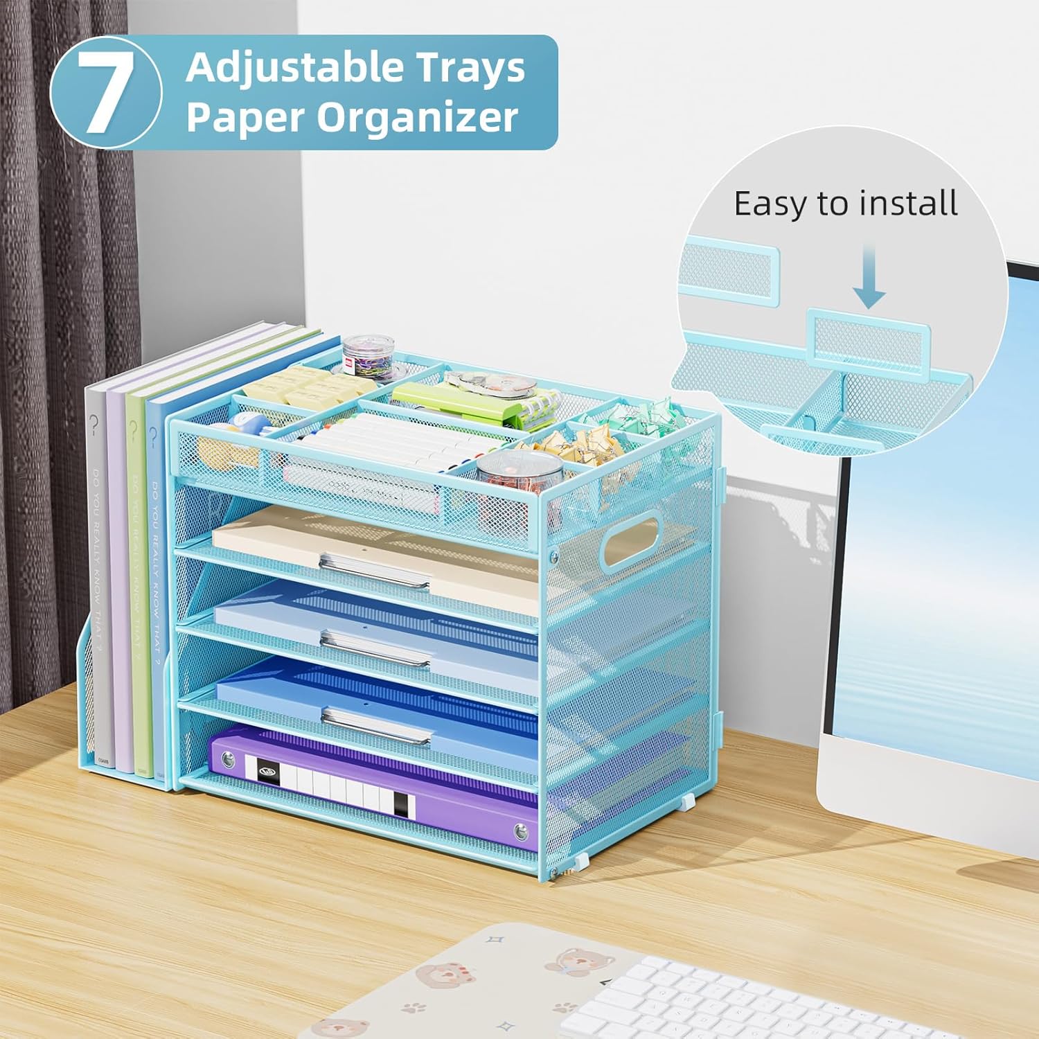 Marbrasse 5-Tier Desk Organizer with File Holder,Paper Letter Tray Organizer,Desktop File Organizer with Adjustable Compartments,Mesh Desk Organizers and Accessories for Office Supplies,Blue