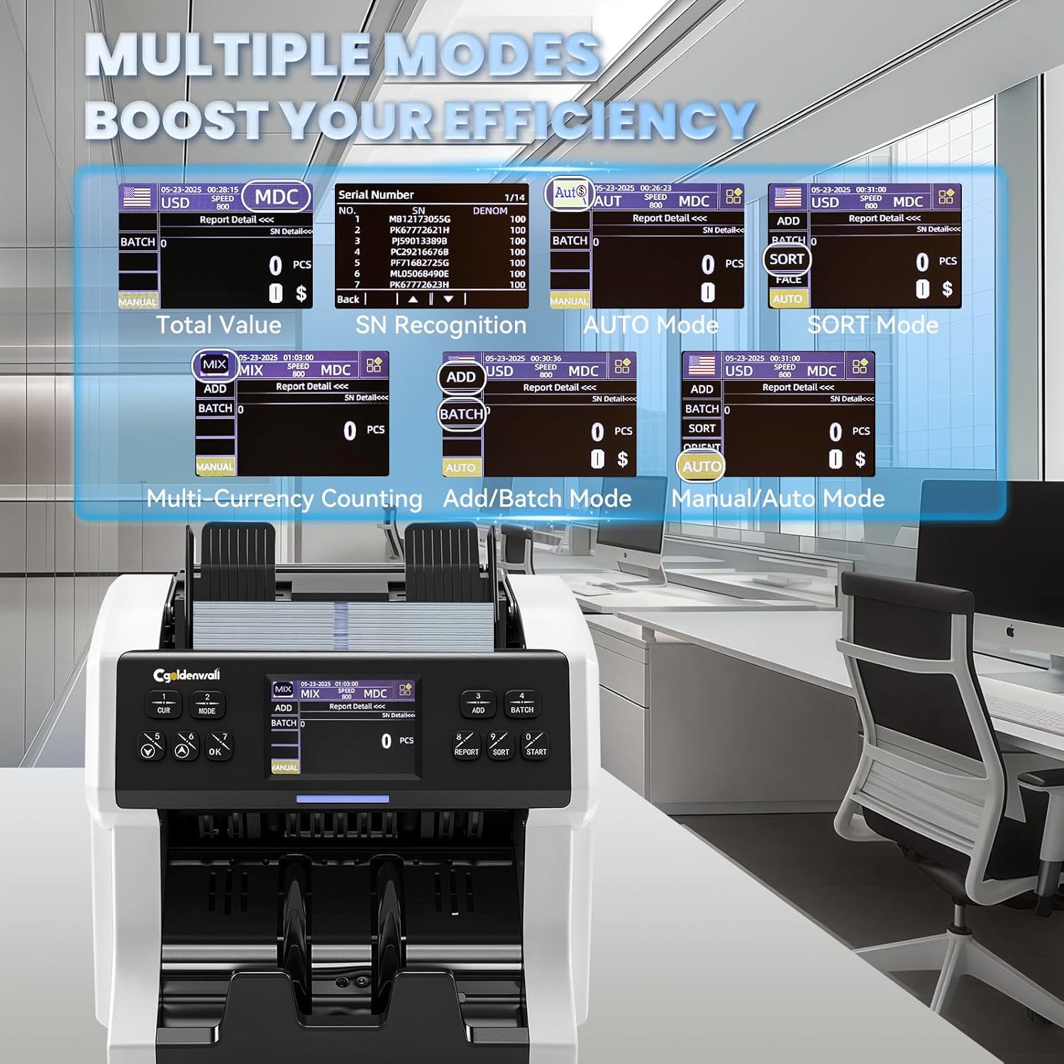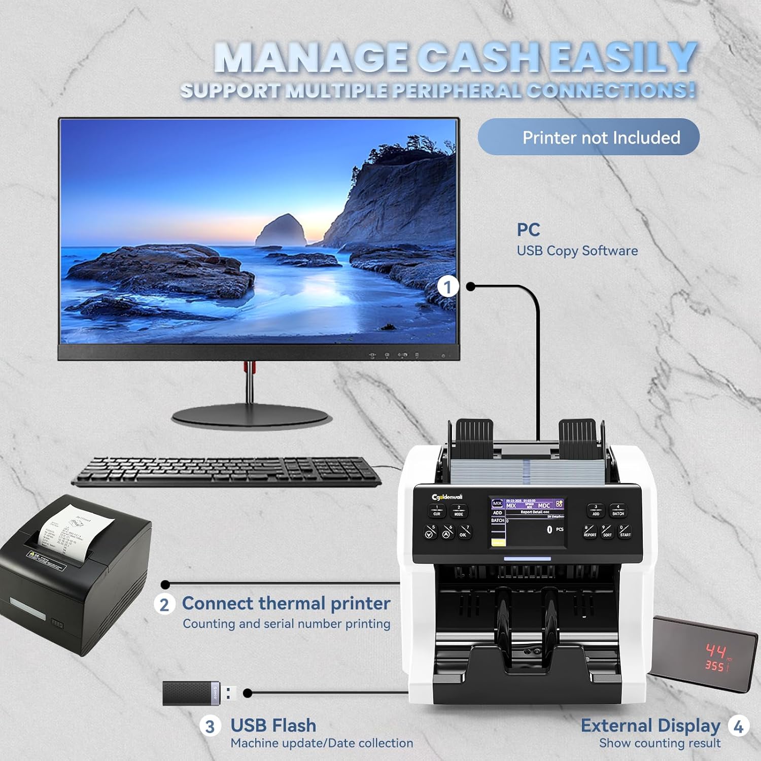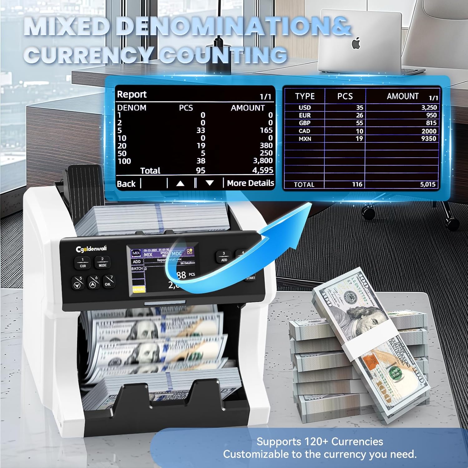 - Perfect For Cash: NEW Upgraded money counter machine mixed denomination boosts your efficiency on cash counting job with the following functions: Mixed denomination counting, Multi-currency support, Auto currency recognition, Sorting based on Denomination, Face, Orientation or currency, ADD & BATCH, Print support, high-speed counting (1500pcs/min). Ideal for the small business, gas station, police department, bank.