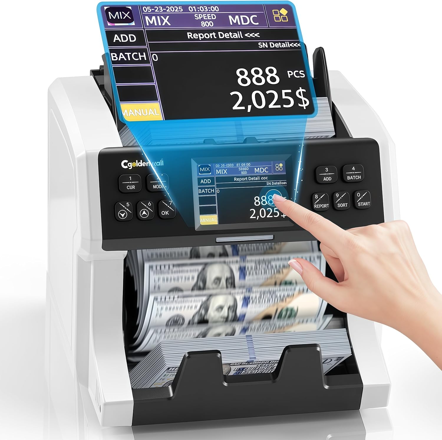 - Boost Your Efficiency: NEW Upgraded Bill counter machine mixed denomination counts and reports total value, clear breakdown of quantity and value by Denom, and serial number. The machine is low noise and durable. The user-friendly TFT touch screen with key buttons makes your cash counting job as easy as possible. The upgraded accessories makes the counting process smoother. Ideal for grocery stores or casinos to deal with heavy cash-counting jobs.
