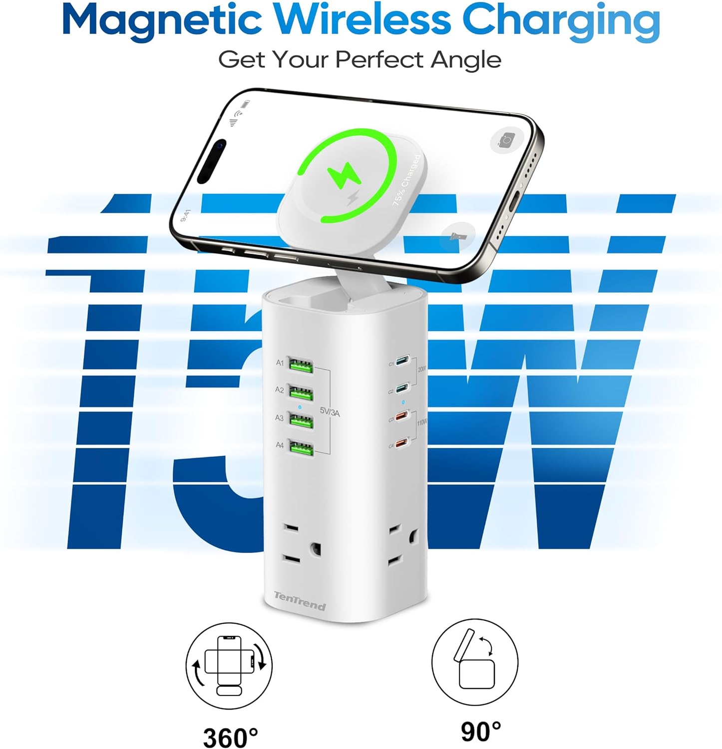 - 【12 in 1 Charging Tower】Featuring 3 AC sockets, 4 USB-C ports & 4 USB-A ports, 1 magnetic charging top. This power strip tower can charge up to 12 devices simultaneously.