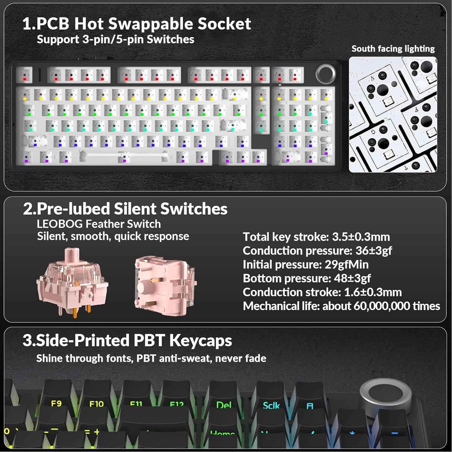- Hot-Swappable Custom Keyboard: The switches and keycaps can be freely replaced(keycap/switch puller are included in the package).This customizable keyboard with hot-swap PCB allows users to replace 3 pins/5 pins switches easily without soldering issue. This F99 Pro silent version mechanical keyboard equipped with pre-lubed quiet switches, brings smooth typing feeling, provides fast response and reduces noise, which make it popular among office workers
