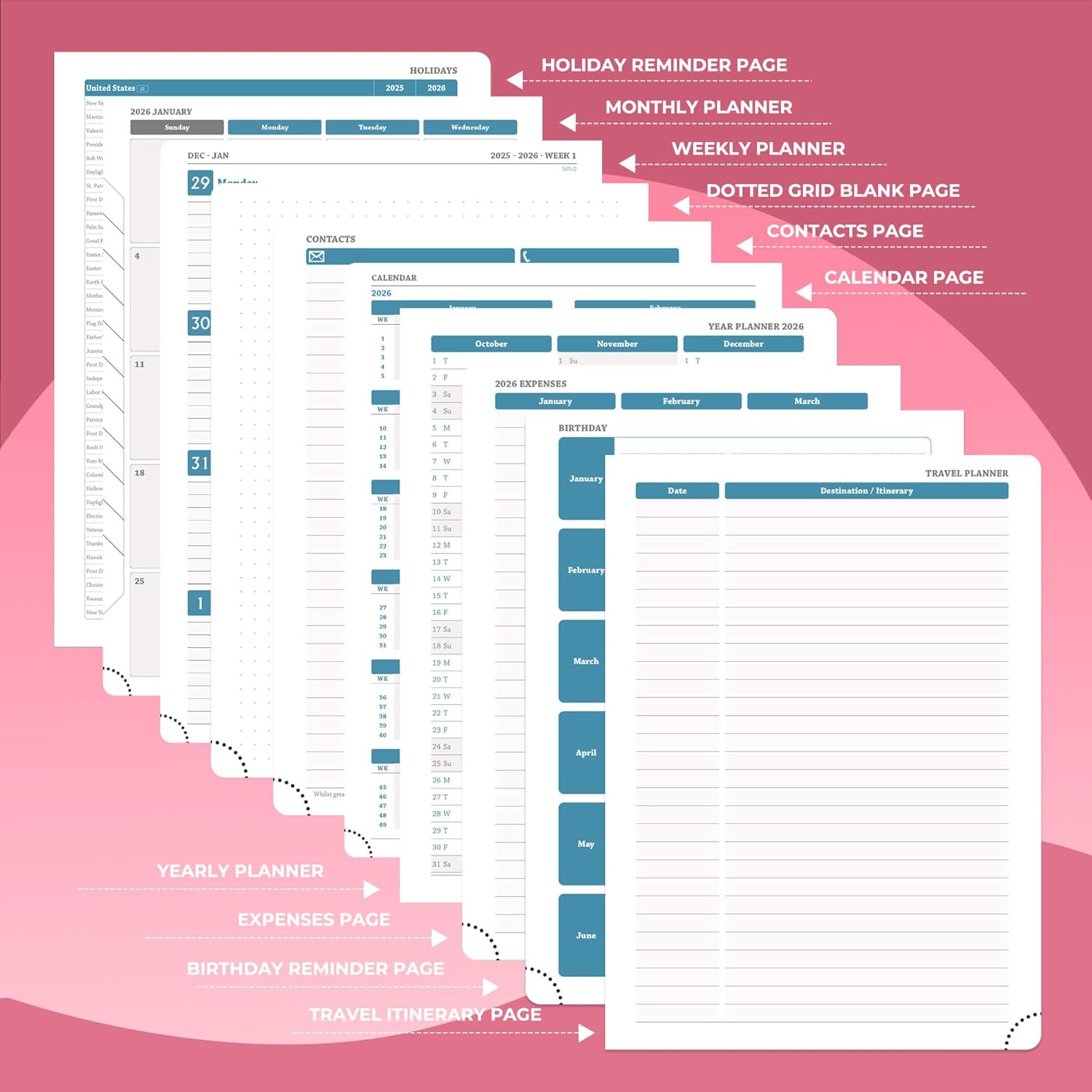 - Universal Design Planner: Suitable for a variety of people and scenarios. Professionals manage project progress, meeting arrangements and goals; student planner 2026 courses, exams and extracurricular activities; home users arrange travel, activitie