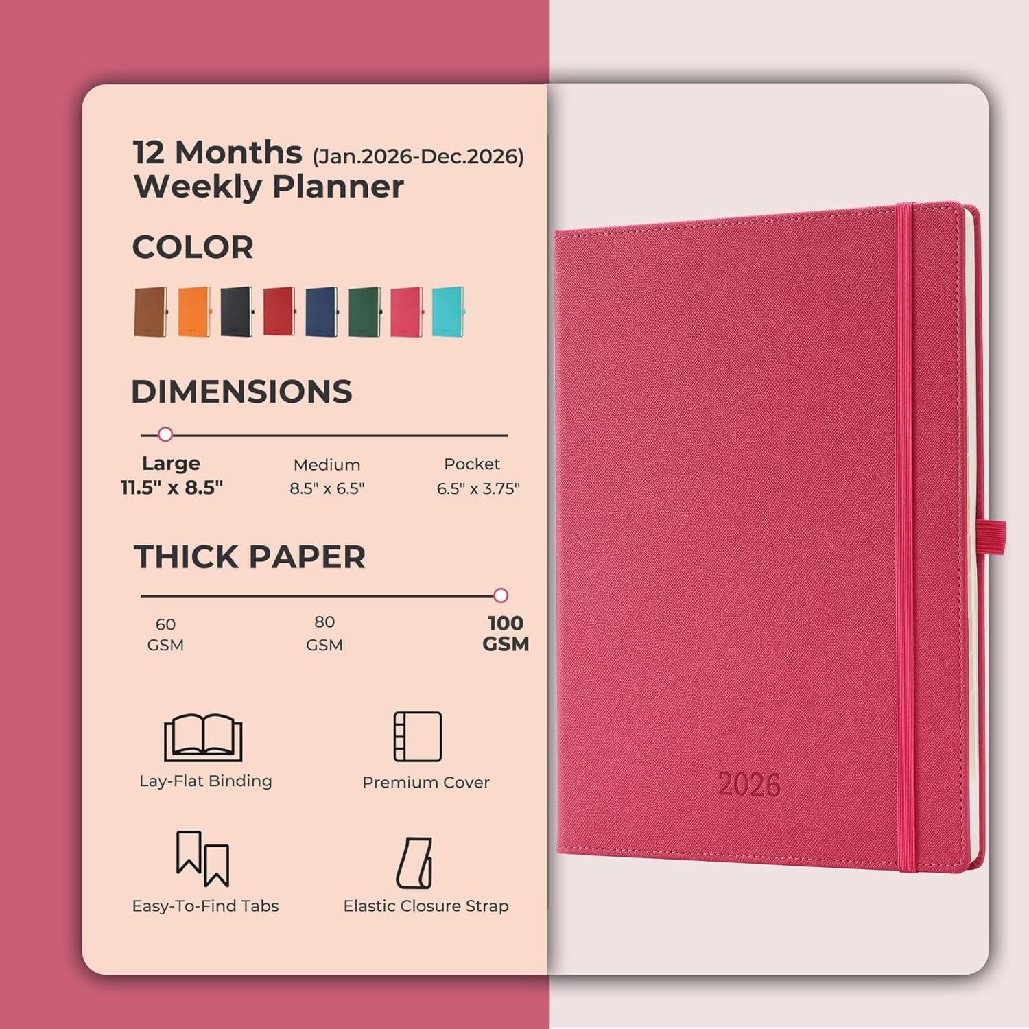 Weekly Monthly 2026 Planner (Jan.26-Dec.26),11.5"x8.5",12 Months Agenda Plan with Month Tabs & Pocket,Expenses/Note Pages, Appointment Book Calendar with Vegan Leather Cover,Rose Red