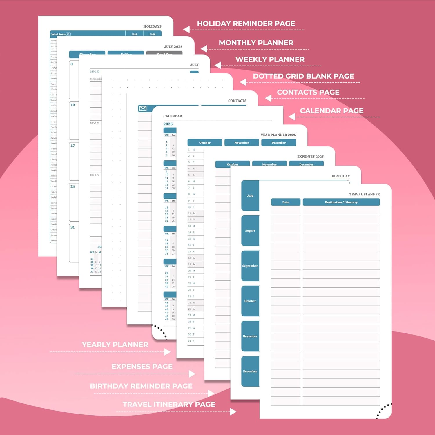 - Multi function Page: Personalized planner system. Year plan pages, holiday reminders, birthday record area for relatives and friends; set up storage contacts, and record inspiration and plans with the dot matrix note area; at the same time, work planner can travel planning and expense management modules to achieve coordination of schedule and finance