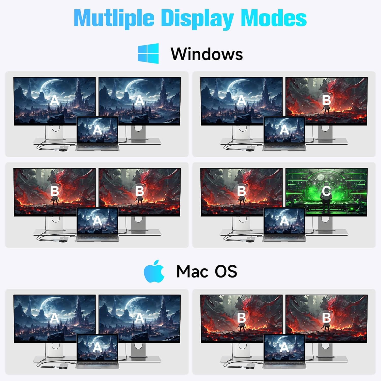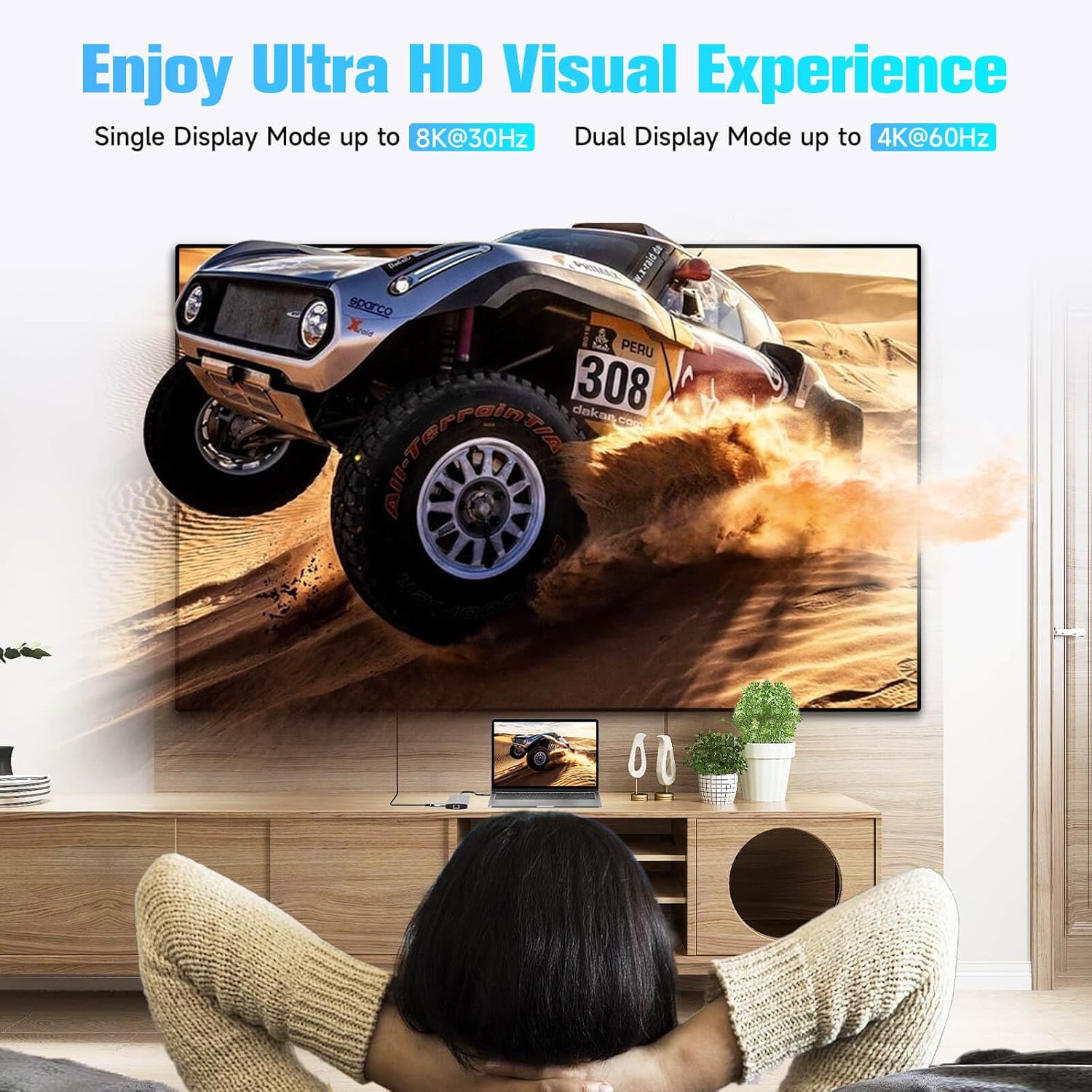 - Docking Station Dual Monitor: The USB-C hub expands your workspace with dual HDMI outputs (4K@60Hz and 8K@30Hz). Seamlessly mirror or extend displays on ultra-high-definition monitors or TVs for presentations, multitasking, or immersive entertainment
