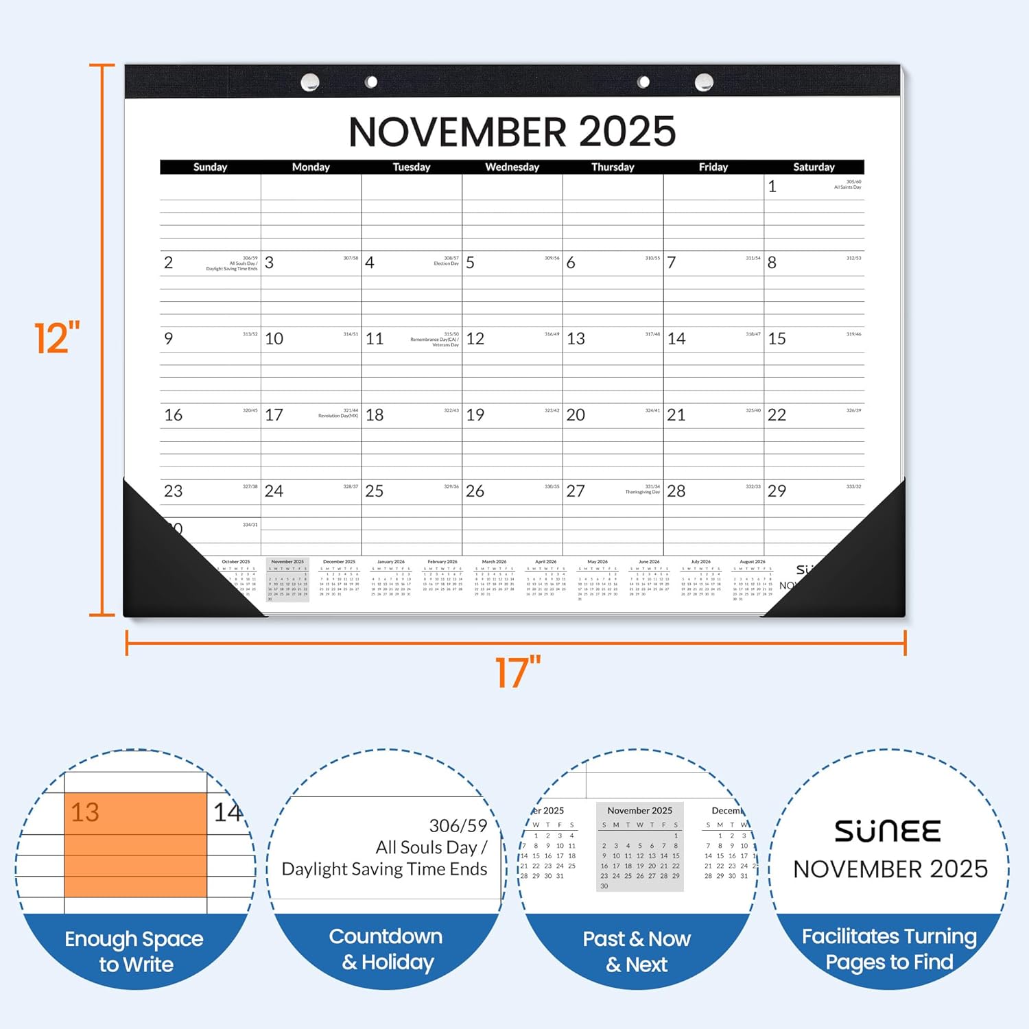 SUNEE Desk Calendar 2025-2026, 18 Months from Oct. 2025 to Mar. 2027, 17"x12" Academic 2026 Calendar for Home, School, or Office Desk Top Organizing, Black Monthy Calendar 2026
