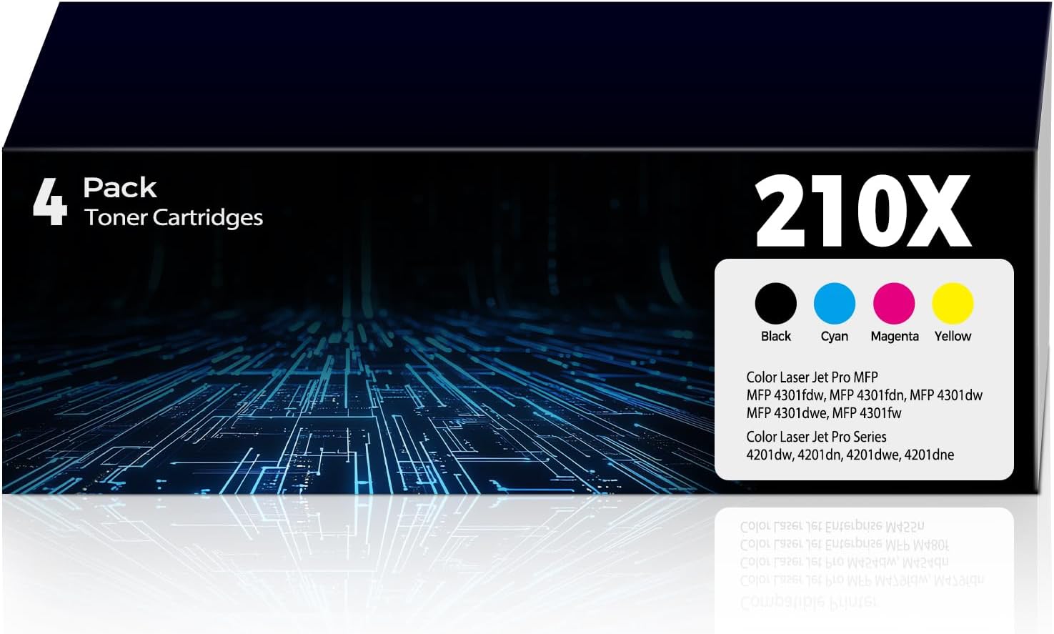 - 210X Toner cartridges Feature: High Yield Toner 210X compatible for hp 210X 210A toner cartridges Black Color Combo Pack compatible for Color Laser Jet Pro MFP 4301fdw Toner, MFP 4301fdn Toner, MFP 4301dw Toner, MFP 4301dwe Toner, MFP 4301fw Toner cartridges, compatible for Color Laser Jet Pro 4201dw Toner, 4201dn Toner, 4201dwe Toner, 4201dne Toner cartridges