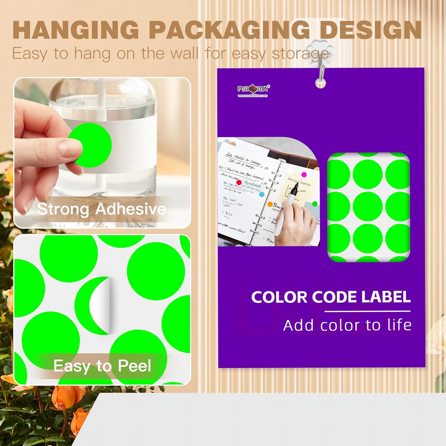 - Cardboard package: 15 sheets 1 inch fluorescent green dot stickers, total 720 pcs round color-code circle label, package size 266mm*185mm