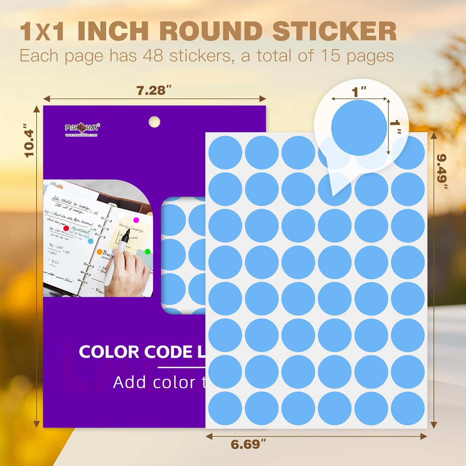 - Cardboard package: 15 sheets 1 inch sky-blue dot stickers, total 720 pcs round color-code circle label, package size 266mm*185mm