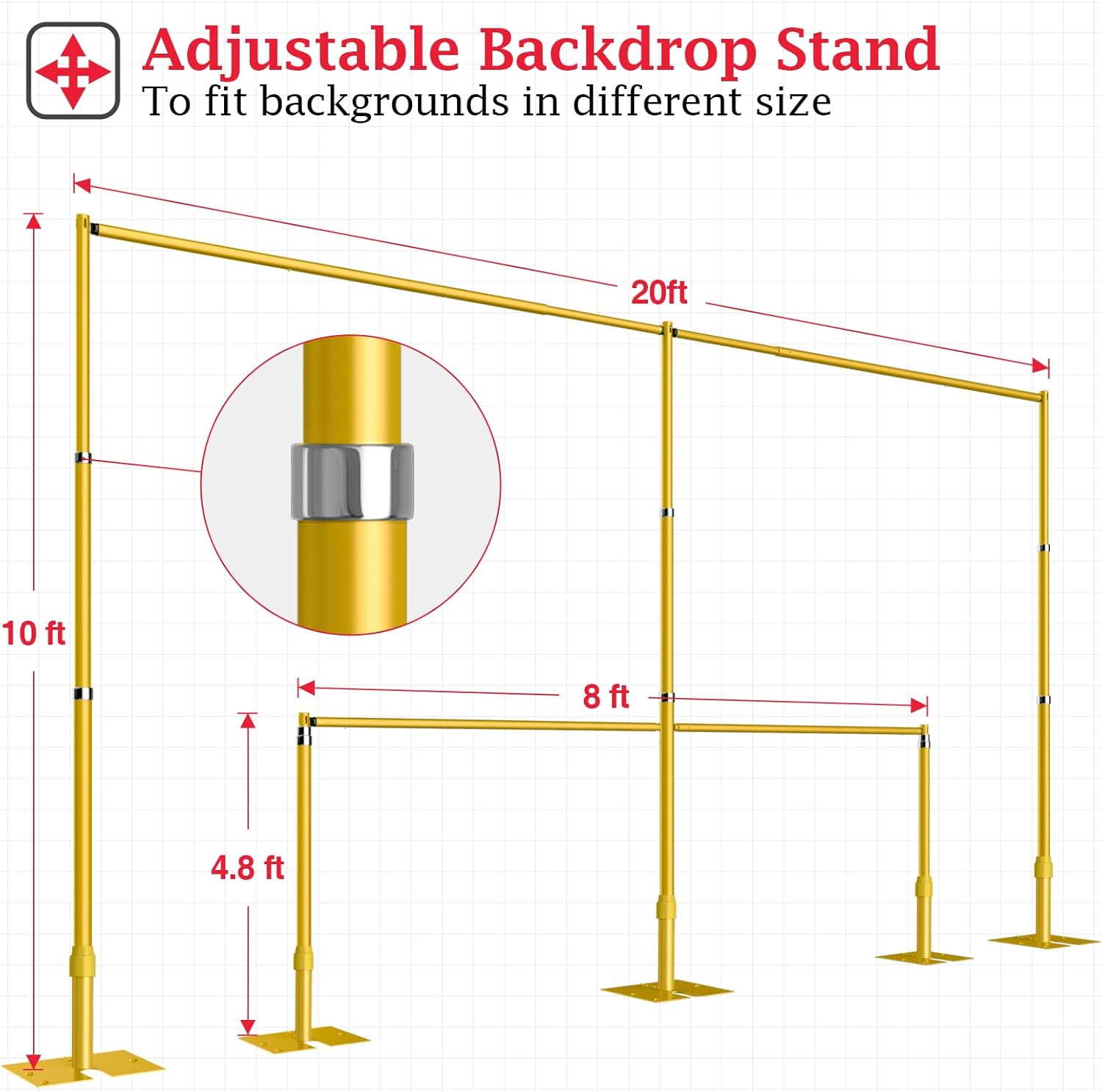 - 【Adjustable Backdrop Stand】The Pipe and drape backdrop stand can be freely assembled into different sizes according on your needs